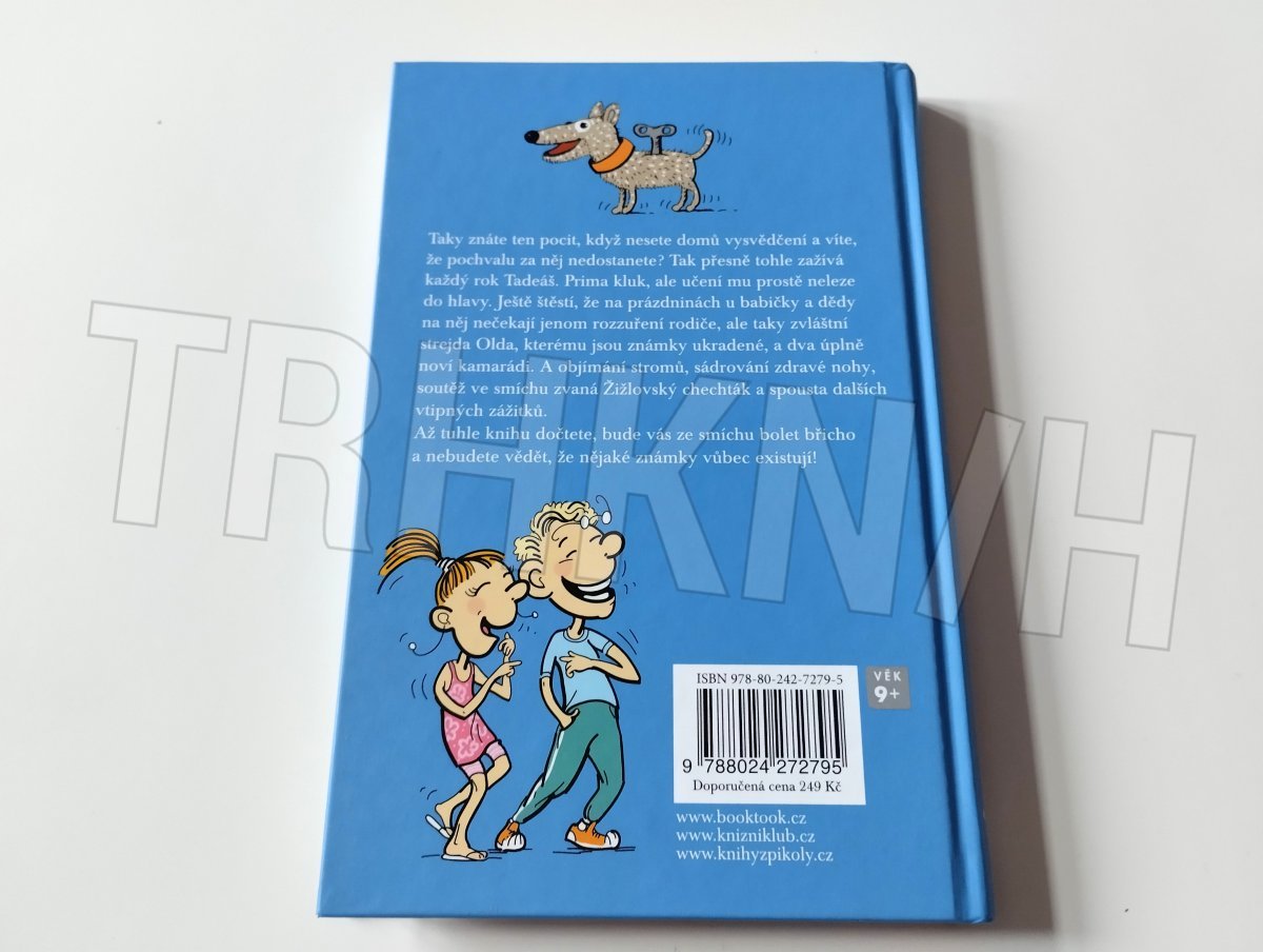 Taky už jste dostali vysvědčení, se kterým se vám vůbec, ale vůbec nechtělo domů? Tadeáš tohle zažívá v jednom kuse. Ne že by byl hloupý, je to náhodou fajn kluk, ale učení mu prostě neleze do hlavy. Naštěstí o prázdninách si trochu odfrkne. Rodiče sice zuří, ale u dědy a babičky na něj naštěstí čeká zvláštní strejda Olda, kterému jsou nějaké známky ukradené. A taky dva noví kamarádi. A spousta bláznivých zážitků, u kterých se budete válet smíchy. Na konci už nebudete vědět, že nějaké známky vůbec existují!