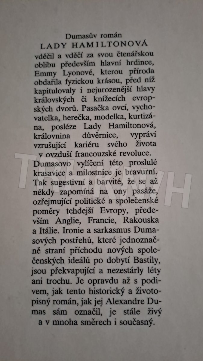 Lady Hamiltonová : historický a životopisný román Autor: Dumas, Alexandre Vydání: 3 Místo vydání: Praha Počet stran: 340 s. Rok vydání: 1989 Vazba: vázaná Stav: dobrý Nakladatel: Melantrich Kategorie: Beletrie Edice, série: kniha Vytvořeno: 2020-11-09 15