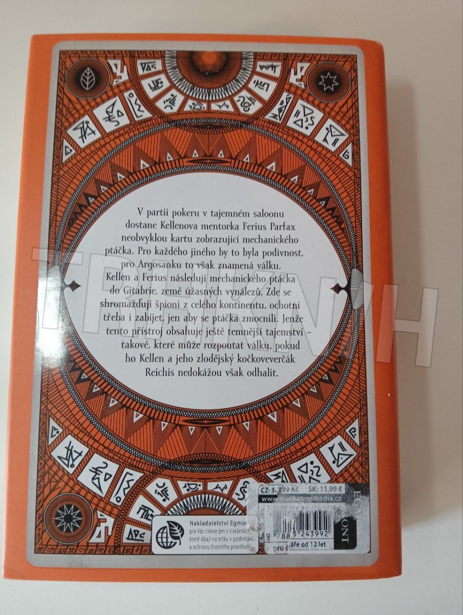 Vydejte se potřetí do magického světa fantasy série Divotvůrce Kellen, Reichis a Ferius cestují do Gitabrie, země proslulé úžasnými vynálezy. Když se k nim zvláštními argosanskými cestami dostane zpráva o mechanickém ptáčkovi oživeném magií, uvědomí si, co všechno je v sázce. Co když Gitabriánci dokážou oživit i něco mnohem nebezpečnějšího? Mezitím jim cestu zkříží neznámý rudý mág a také nečekaný jan’tepský spojenec. Čas nemilosrdně ubíhá a karty ve Feriusině balíčku varují před blížící se válkou.
