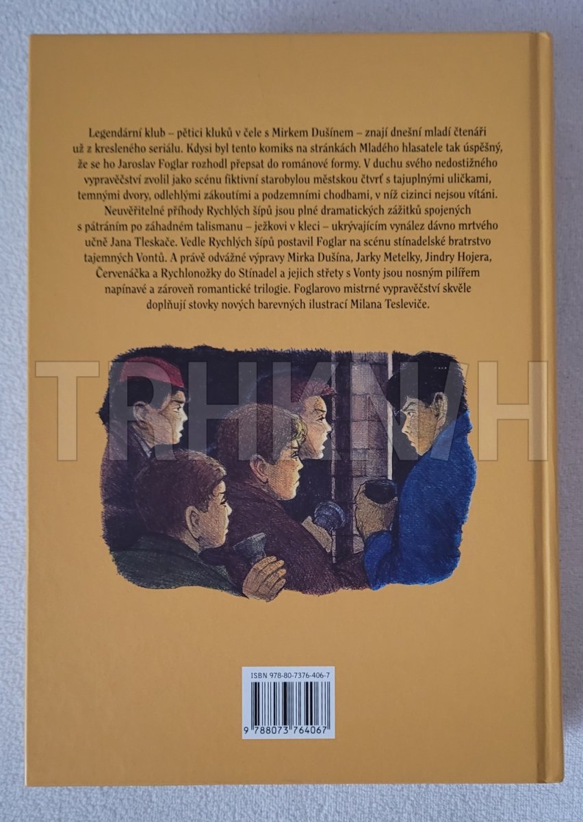 Legendární klub - pětici kluků v čele s Mirkem Dušínem - znají dnešní mladí čtenáři už z kresleného seriálu. Kdysi byl tento komiks na stránkách Mladého hlasatele tak úspěšný, že se ho Jaroslav Foglar rozhodl přepsat do románové formy. V duchu svého nedostižného vypravěčství zvolil jako scénu fiktivní starobylou městskou čtvrť s tajuplnými uličkami, temnými dvory, odlehlými zákoutími a podzemními chodbami, v níž cizinci nejsou vítáni. Neuvěřitelné příhody Rychlých šípů jsou plné dramatických zážitků spojených s pátráním po záhadném talismanu – ježkovi v kleci – ukrývajícím vynález dávno mrtvého učně Jana Tleskače. Vedle Rychlých šípů postavil Foglar na scénu stínadelské bratrstvo tajemných Vontů.