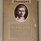 "Nesmírně čestná a krásná úloha připadla J.W. v historii naší literatury a národa vůbec: je básníkem raného mládí komunismu v naší vlasti, "říká v předml. F. Nečásek, nastiňuje W. vývoj od sv. "Host do domu", kdy W. byl ještě jen "básník, jenž miloval svět", motivuje jeho přerod v básníka-bojovníka, "těžkou hodinu," kdy v krvi a bolesti dochází W. k poznání, že je třeba mít "nejen dobré srdce, ale též dobré pěsti". Básník poznal a procítil, že komunismus si žádá člověka celého, nových mravních vlastností, a že takto nové musí být i revoluční proletář. umění. Zápas o toto umění byl W. i zápasem za lidovost, prostotu a srozumitelnost umění, za realistickou tvůrčí methodu. "Jediný z našich mladých viděl, a věděl, že ne z buržoas. rafinovanosti, ale ze zdravého základu naší klasiky, našeho umění, vyrostlého z lidu a pro lid, vede cesta k socialismu." (Z. Nejedlý.) Výbor obs.: Jinoš. verše, Lyrika zrání, Fragmenty, Bás. v próze, Pohádky, Povídky, Zápisky z nemoci, Studie a stati, Z dopisů A.M. Píšovi, Host do domu, Těžká hodina, básně z pozůstalosti. - "W. je atheista a filosof. materialista. Ta W. víra, to je aktivní princip v člověku, to je kus kultur. pokladu v člověku, to je věc pocitu příslušnosti k lid. živlu, k nesmírnému, nesmrtelnému kolektivu práce ... Je to historický optimismus nové společenské třídy." (Lad. Štoll.)