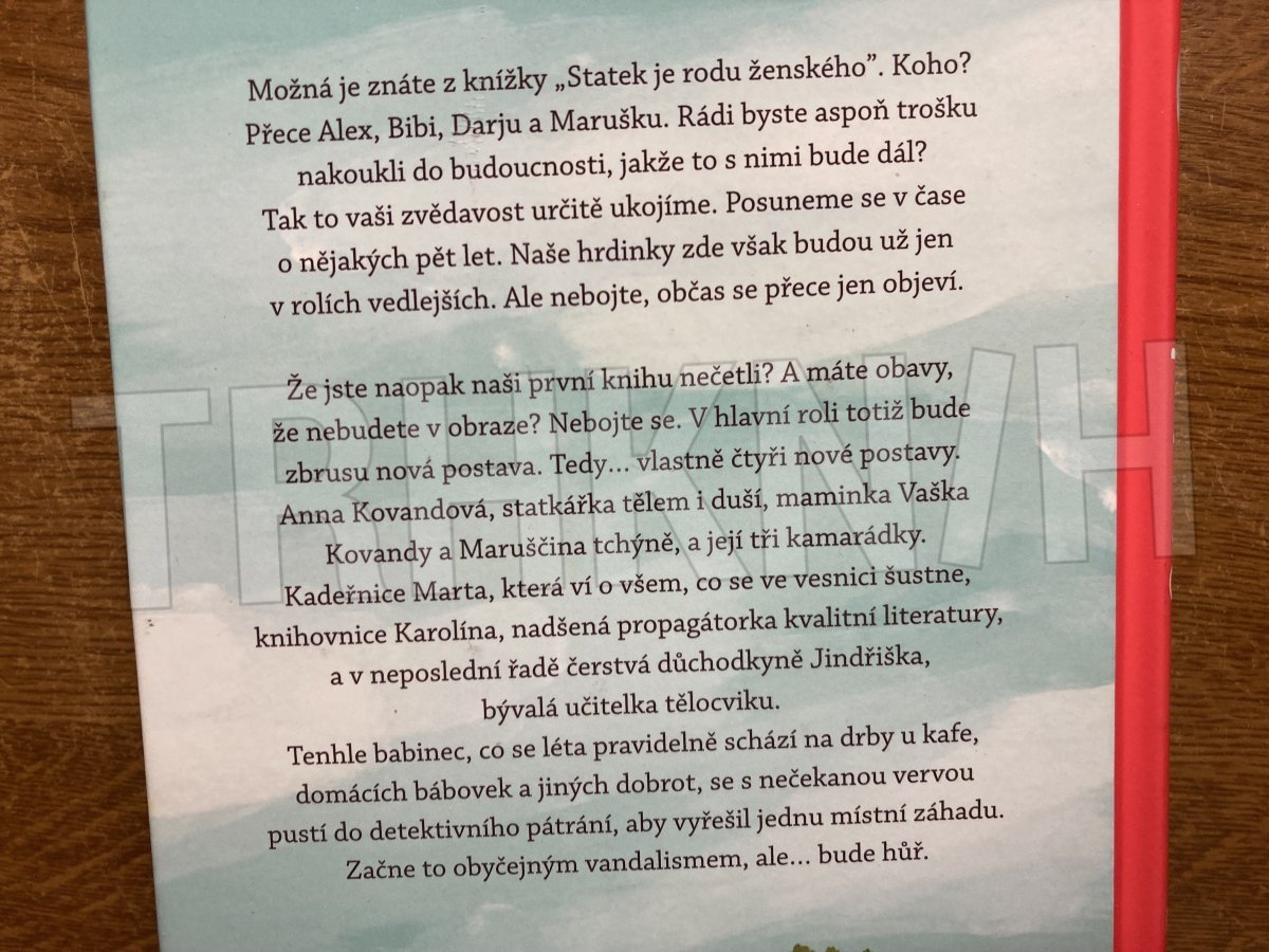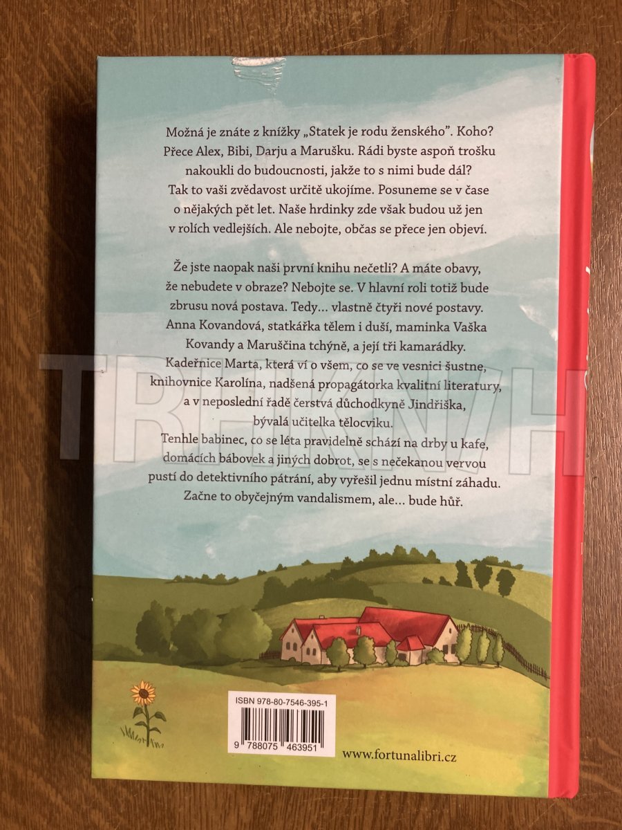 V hlavní roli bude zbrusu nová postava, vlastně čtyři: Anna Kovandová, statkářka tělem i duší, maminka Vaška Kovandy a Maruščina tchýně, a její tři kamarádky. Kadeřnice Marta, která ví o všem, co se ve vesnici šustne, knihovnice Karolína, nadšená propagátorka kvalitní literatury, a v neposlední řadě čerstvá důchodkyně Jindřiška, bývalá učitelka tělocviku. Tenhle babinec, co se léta pravidelně schází na drby u kafe, domácích bábovek a jiných dobrot, se s nečekanou vervou pustí do detektivního pátrání, aby vyřešil jednu místní záhadu. Začne to obyčejným vandalismem, ale bude hůř.