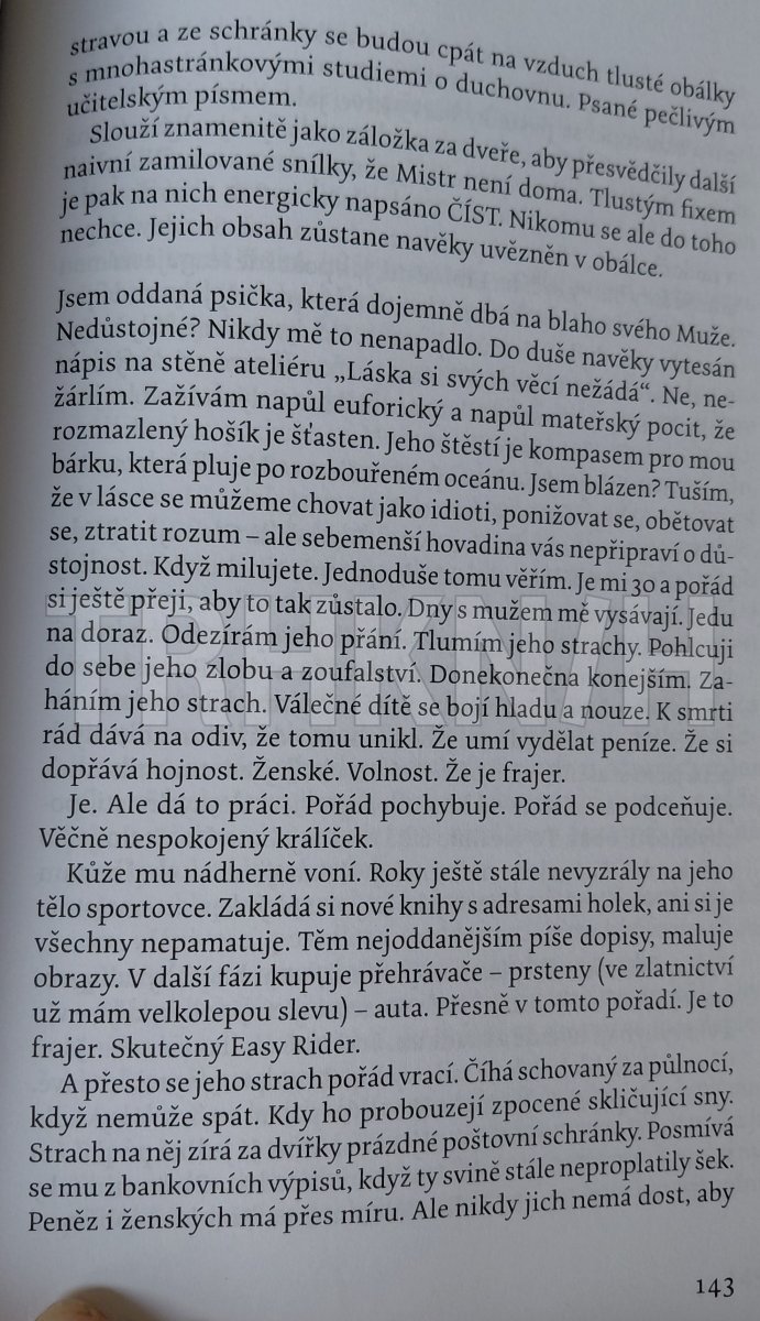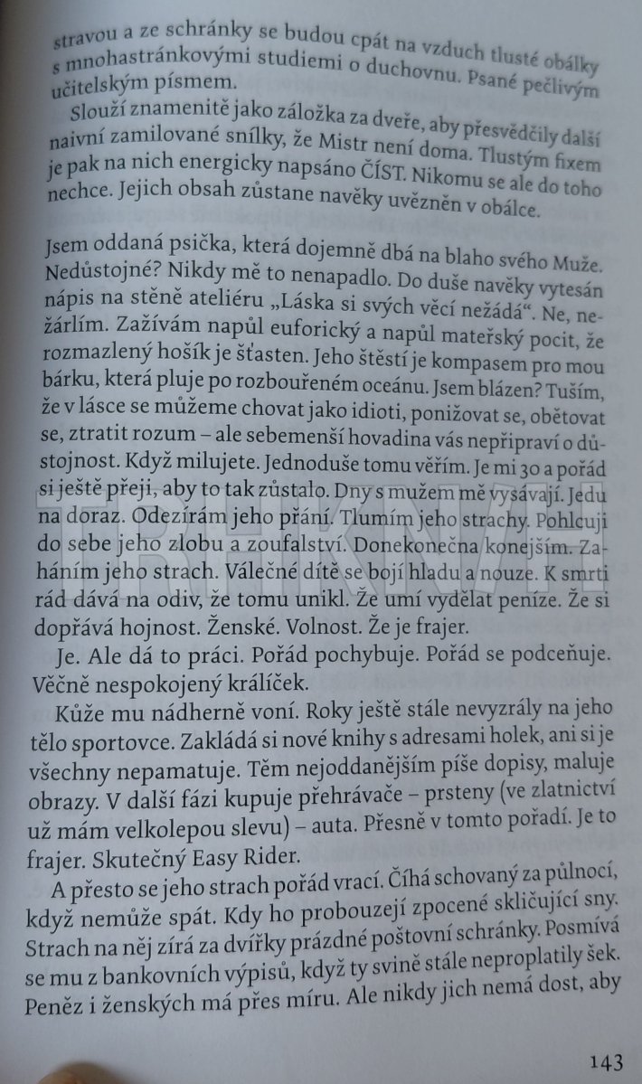 Až brutálně upřímná a sarkastická zpověď od raného dětství po dospělou současnost. Skutečnost a fikce... Autorka ji popisuje z pohledu malého dítěte, dospívající vzdorovité holky, zamilované ženské, která vstupuje do světa mužů a nestačí se divit. Osudové setkání s Mužem, který ovlivnil její život a kterému ovlivnila život ona. Mateřství bez obvyklých sladkých přívlastků. A blížící se tragédie, ke které se nevratně schyluje. Anebo ne?