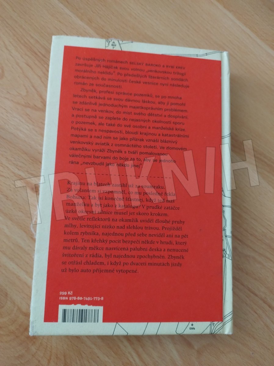 Po úspěšných románech Selský baroko a Rybí krev završuje Jiří Hájíček svou volnou „venkovskou trilogii morálního neklidu“. Po předešlých literárních sondách obrácených do minulosti české vesnice nyní následuje román ze současnosti. Zbyněk, profesí správce pozemků, se po mnoha letech setkává se svou dávnou láskou, aby jí pomohl se zdánlivě jednoduchým majetkoprávním problémem. Vrací se na venkov, do míst svého dětství a dospívání, a postupně se zaplete do nejasných okolností sporu o pozemek, ale také do své osobní a manželské krize. Potýká se s nespavostí, bloudí krajinou a katastrálními mapami a nad ním se jako přízrak vznáší bláznivý venkovský aviatik z osmnáctého století. Ve zlomovém okamžiku vyráží Zbyněk s tváří pomalovanou válečnými barvami do boje za to, aby se jednoho rána „nevzbudil jako někdo jinej“.