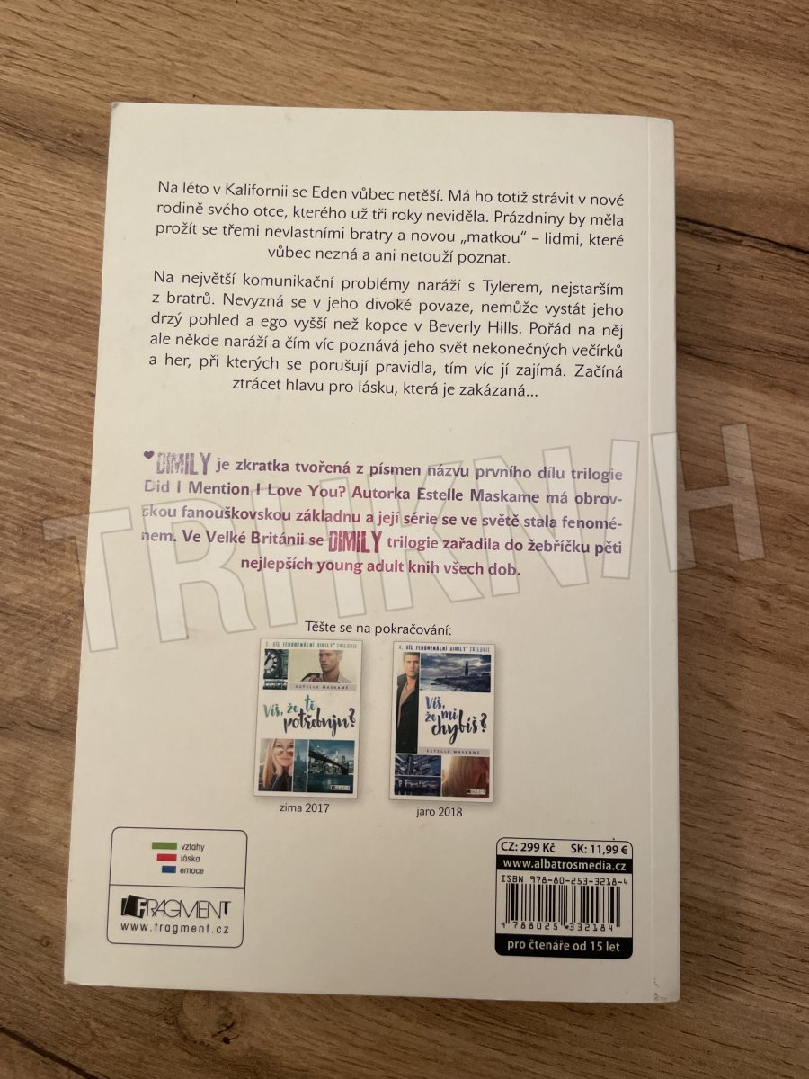 Seznámit se s novou rodinou vlastního otce, kterého jste neviděli několik let, to nezní jako lákavé prázdniny v Kalifornii! Eden se potkává se třemi nevlastními bratry, z nichž ten nejstarší je černou ovcí rodiny a od začátku s ním naráží na komunikační problémy. Čím víc se jej snaží pochopit a najít k němu cestu, tím je jí jasnější, že k němu cítí mnohem víc. Tyler je ale složitá osobnost a jednoduché to s ním opravdu nebude. *DIMILY je zkratka tvořená z prvních písmen názvu prvního dílu trilogie Did I Mention I Love You? Autorka Estelle Maskameová má obrovskou fanouškovskou základnu a její série se ve světě stala fenoménem. Ve Velké Británii se DIMILY trilogie zařadila do žebříčku pěti nejlepších young adult knih všech dob.