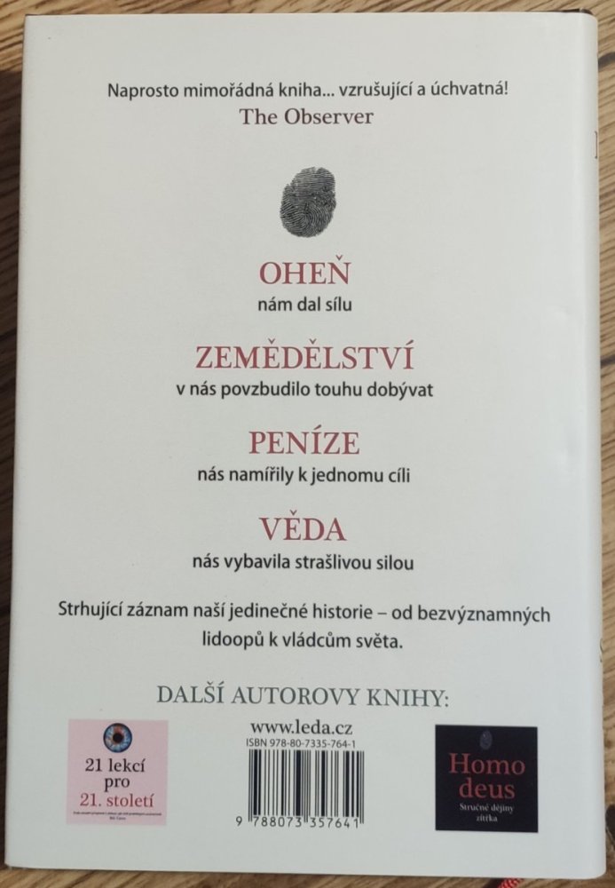 SAPIENS – STRUČNÉ DĚJINY LIDSTVA sleduje z dlouhodobé perspektivy revoluční zvraty na cestě lidského rodu od vzniku Homo sapiens až po současnost. Dramatický je příběh bezvýznamného lidoopa, který před dvěma miliony let někde v koutě Afriky získal vědomí, vyvraždil své přírodní bratrance a ovládl celou planetu. Základní životní parametry člověka jsou určeny biologicky, ale poskytují úžasný prostor. Ne biologie, ale kultura (kolektivní víra) je klíčem k pochopení dramatického rozvoje lidstva. Jen ona umožňuje spolupráci velkého počtu lidí, kteří se navzájem neznají. Po první, kognitivní revoluci před 70 000 lety následovaly další překvapivé zlomy v dějinách – objev zemědělství, peněz, společenské mytologie, imperiální společnosti, kapitalistického úvěru a víry v budoucnost, objev vědy, techniky i genetického inženýrství. Zdá se, že dějiny mají směr – vždyť obchod a kapitalismus, věda a technika, planetární komunikace i geopolitické vědomí spojily svět do globální vesnice. "Proč se z knihy SAPIENS Yuvala Harariho okamžitě stal mezinárodní bestseller? Je to jednoduché: odpovídá na nejzásadnější otázky historie i moderního světa a čte se jedním dechem. Nemůžete se od ní odtrhnout!" (Jared Diamond, nositel Pulitzerovy ceny, autor knih Osudy lidských společností, Kolaps a The World until Yesterday).