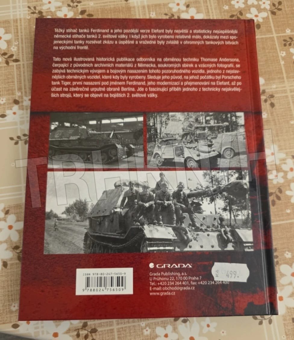 Těžký stíhač tanků Ferdinand a jeho pozdější verze Elefant byly největší a statisticky nejúspěšnější německé stíhače tanků 2. světové války. I když jich bylo vyrobeno relativně málo, dokázaly mezi spojeneckými tanky rozsévat zkázu a úspěšné a vražedné byly zvláště v ohromných tankových bitvách na východní frontě. Tato nová ilustrovaná historická publikace odborníka na obrněnou techniku Thomase Andersona, čerpající z původních archivních materiálů z Německa, soukromých sbírek a vzácných fotografií, se zabývá technickým vývojem a bojovým nasazením tohoto pozoruhodného vozidla, jednoho z nejslavnějších obrněných vozidel, které kdy byly vyrobeny. Sleduje jeho původ, na jehož počátku byl Porscheho tank Tiger, první nasazení pod jménem Ferdinand, jeho modernizaci a přejmenování na Elefant...