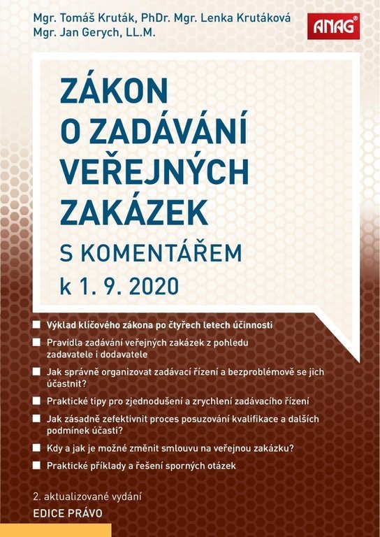 Aktualizované vydání zákona o zadávání veřejných zakázek přináší bohatý komentář k jednotlivým ustanovením. Nové vydání je obohaceno o poznatky a zkušenosti získané v období čtyř let, které od nabytí účinnosti zákona uplynuly. Skvělý pomocník pro praxi Kniha Zákon o zadávání veřejných zakázek s komentářem k 1. 9. 2020 přináší odpovědi na četné otázky, na něž nebylo v době nabytí účinnosti zákona možné jednoznačně odpovědět. Pomocí řady praktických příkladů vysvětluje, jak správně chápat a aplikovat jednotlivá ustanovení zákona. Podrobněji k obsahu publikace Publikace zohledňuje aktuální rozhodnutí orgánů dohledu a opírá se o bohaté zkušenosti autorů z praxe. Komentář se vedle základních institutů veřejného zadávání, k nimž patří jednotlivé kategorie zadavatelů, systematika druhů veřejných zakázek a stanovení jejich předpokládané hodnoty, podrobně věnuje jednotlivým postupům zadavatele v zadávacích řízeních, včetně koncesního řízení, a podmínkám pro jejich použití. Dále se zaměřuje na novinky v oblasti uzavírání rámcových dohod a dalších zvláštních postupů zadavatele a rozebírá aktuální požadavky týkající se uzavírání smluv a jejich změn. Publikace zahrnuje také prováděcí právní předpisy k zákonu a bohatou přílohovou část. Využití publikace Tato publikace bude proto cenným pomocníkem pro zadavatele, dodavatele, ale také administrátory veřejných zakázek a další osoby podílející se na průběhu zadávacích řízení.