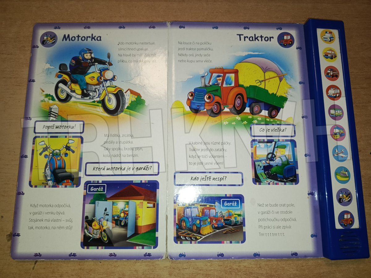 Tato knížka pomůže dětem seznámit se se zvuky dopravních prostředků. Stačí lehce stisknout obrázek na zvukové hračce, zaposlouchat se a zvuky napodobit. Kniha obsahuje hezké obrázky a také verše se stručným popisem dopravního prostředku a toho, co dělá.