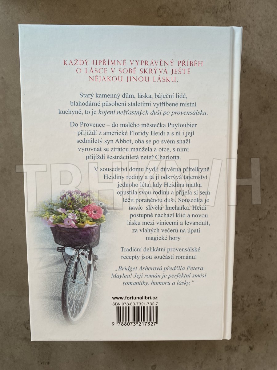 Každý upřímně vyprávěný příběh o lásce v sobě skrývá ještě nějakou jinou lásku. Starý kamenný dům, láska, báječní lidé, blahodárné působení staletími vytříbené místní kuchyně, to je hojení nešťastných duší po provensálsku. Do Provence – do malého městečka Puyloubier – přijíždí z americké Floridy Heidi a s ní i její sedmiletý syn Abbot, oba se po svém snaží vyrovnat se ztrátou manžela a otce, s nimi přijíždí šestnáctiletá neteř Charlotta. V sousedství domu bydlí důvěrná přítelkyně Heidiny rodiny a ta jí odkrývá tajemství jednoho léta, kdy Heidina matka opustila svou rodinu a přijela si sem léčit svou poraněnou duši. Sousedka je navíc skvělá kuchařka. Heidi postupně nachází klid a novou lásku mezi vinicemi, levandulí, za vlahých večerů na úpatí magické hory. Tradiční delikátní provensálské recepty jsou součástí románu! “Bridget Asherová předčila Petera Maylea! Její román je perfektní směs romantiky, humoru a lásky.” Bridget Asherová napsala knihy My Husband’s Sweethearts (Milenky mého manžela) a The Pretend Wife (Fingovaná manželka). Žije na severozápadě Floridy, ale vždy velice ráda provádí literární průzkumy v Provenci.