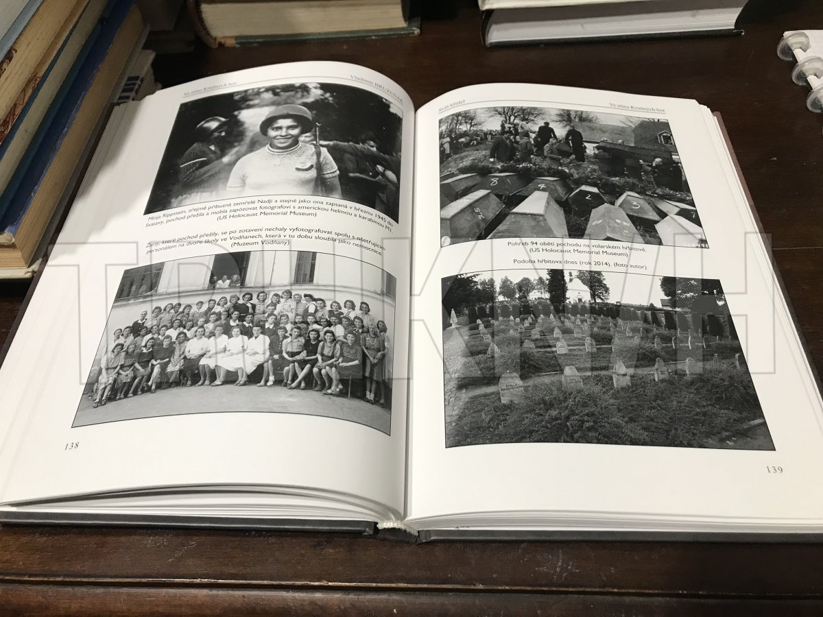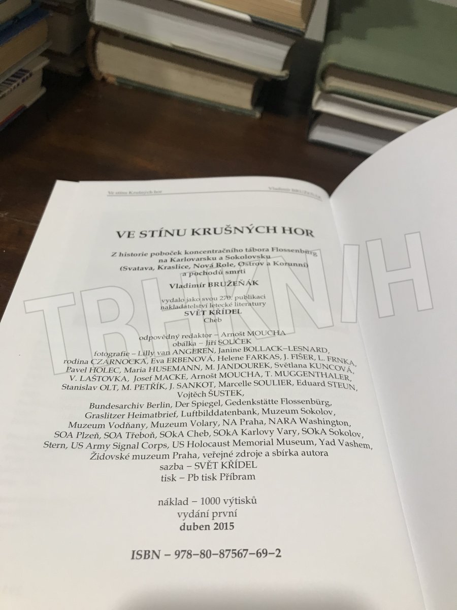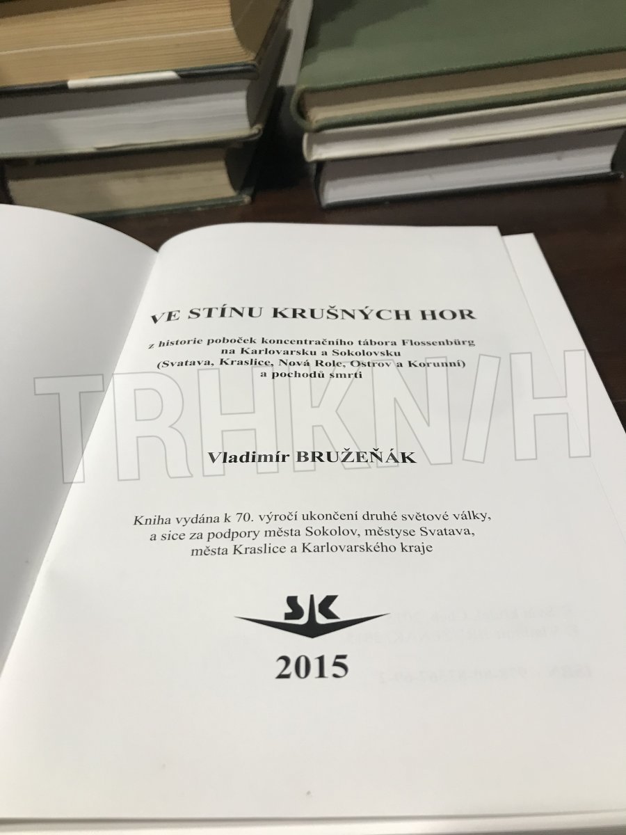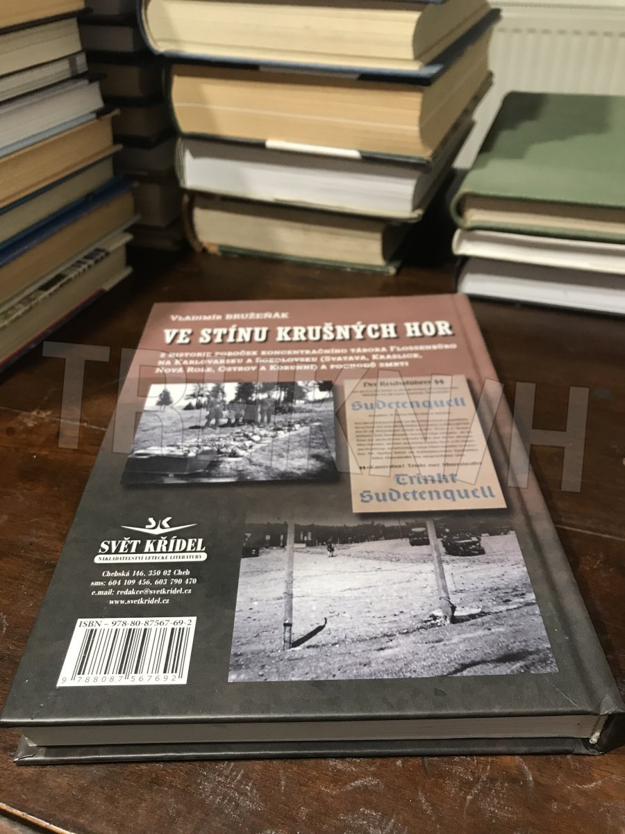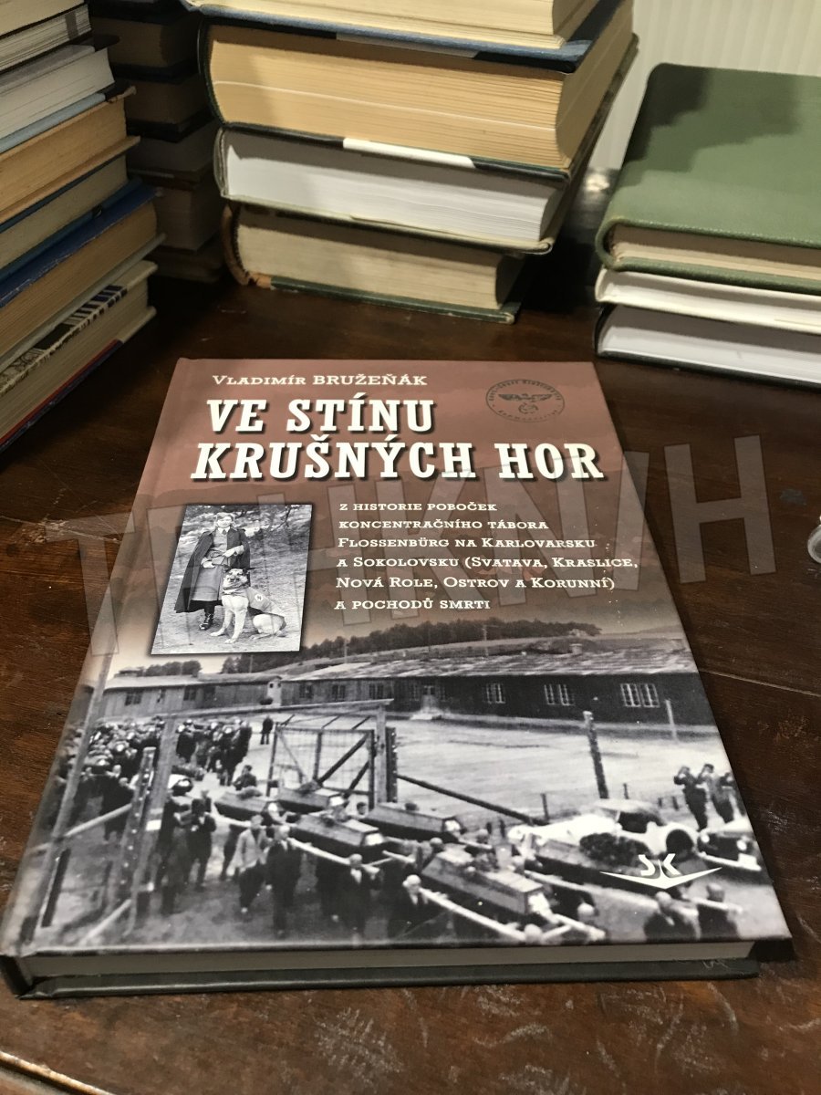 Kniha Ve stínu Krušných hor se s použitím maximálního množství dostupných pramenů pokouší čtenáři odhalit pravdu o historii poboček koncentračního tábora Flossenbürg na území Karlovarska. Tedy o táborech ve Svatavě, Kraslicích, Nové Roli, Ostrově a Korunní. Přináší dosud zcela neznámé a mnohdy unikátní informace o fungování táborů, o jejich velitelích i obětech, jakož i detailní popisy průběhu tzv. pochodů smrti, jež v závěru 2. světové války konec existence těchto táborů provázely. Kniha je doprovázena skoro třemi sty zcela jedinečnými fotografiemi.
