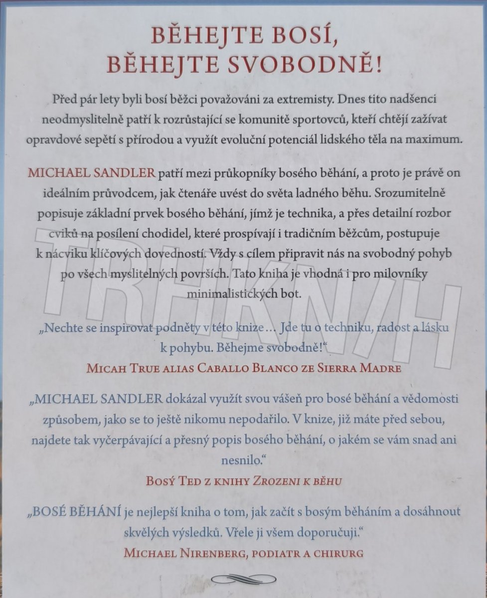 Před pár lety byli bosí běžci považováni za extremisty. Dnes se na ně sice většina lidí stále kouká skrz prsty, ale tito nadšenci neodmyslitelně patří k rozrůstající se komunitě sportovců, kteří chtějí zažívat opravdové sepětí s přírodou a využít evoluční potenciál na maximum. Michael Sandler patří mezi průkopníky bosého běhání, a proto je právě on ideálním průvodcem. Srozumitelně popisuje základní prvek bosého běhání, jímž je technika, a přes detailní rozbor cviků na posílení chodidel postupuje k nácviku běžeckých dovedností, jejichž cílem je připravit vás na svobodný pohyb po všech myslitelných površích. Tato kniha je vhodná i pro milovníky minimalistických bot. Současně poskytuje množství rad i pro obuté běžce, kteří chtějí posílit chodidla a zlepšit svou techniku.