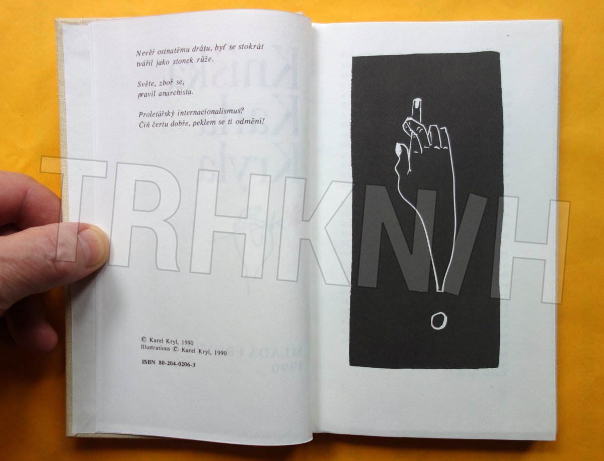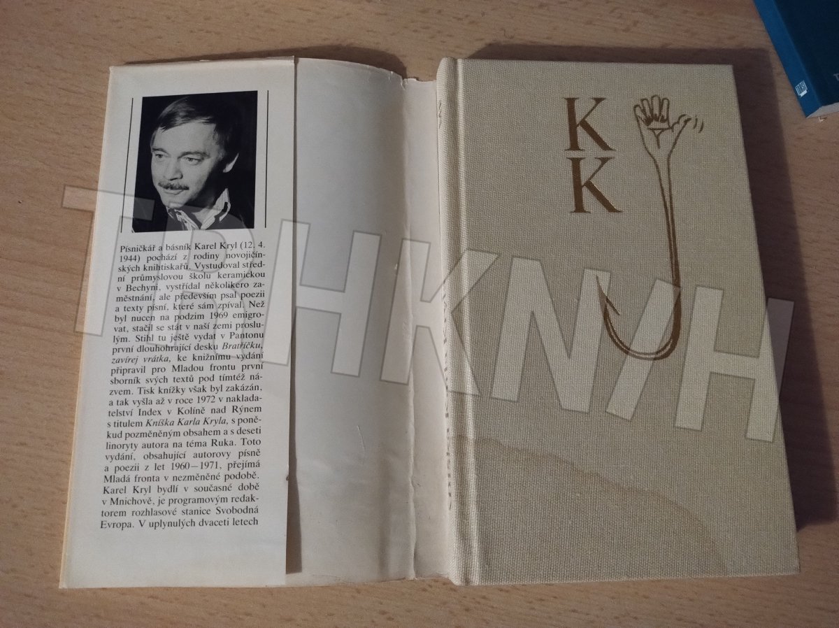 Hnidopišský nedostatek: tři nepatrné skvrnky na pravé předsádce - nafoceno. Ke knize jako bonus kytarové trsátko Ahoj Občani ! Karel Kryl.