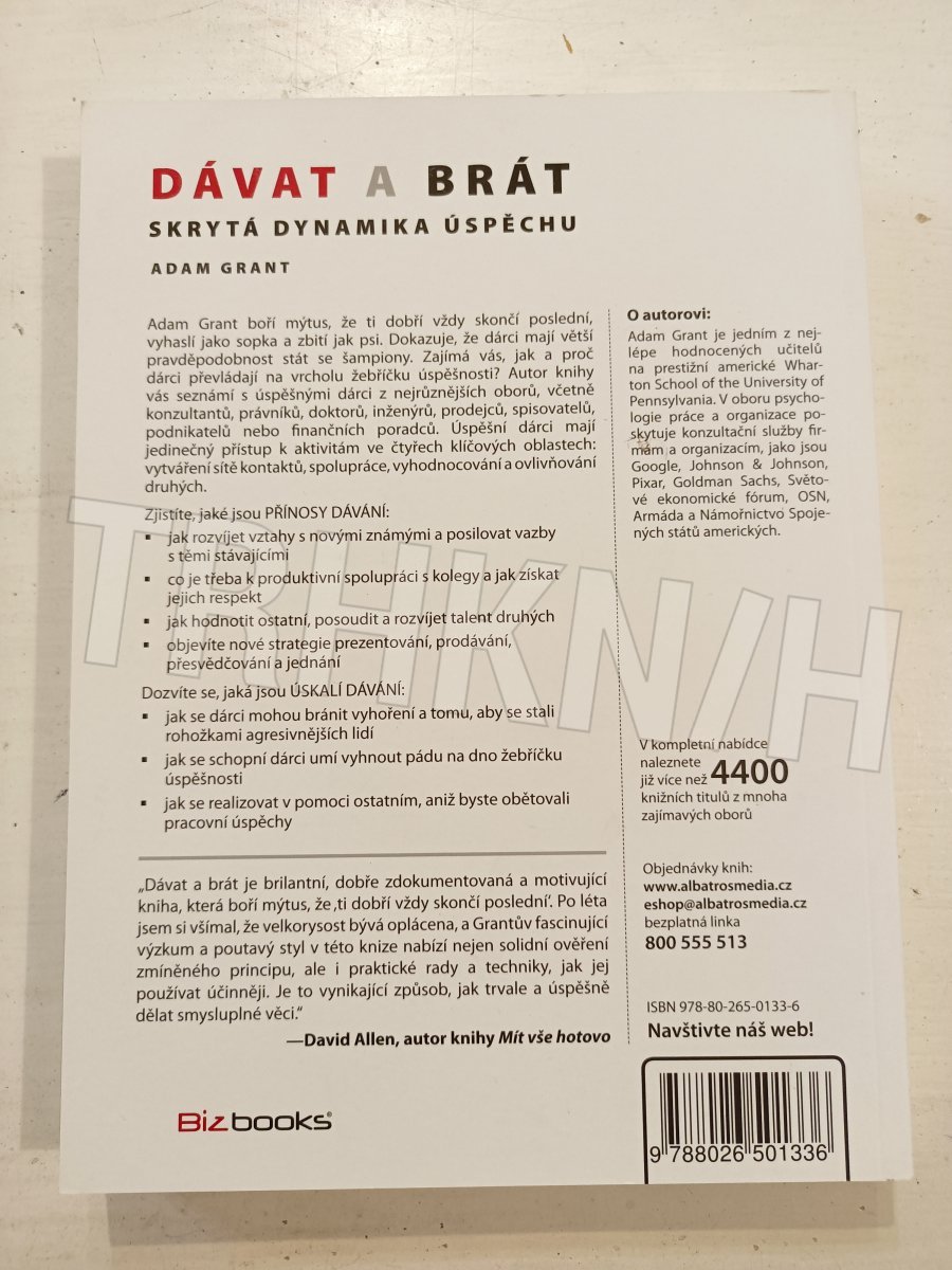 Adam Grant boří mýtus, že ti dobří vždy skončí poslední, vyhaslí jako sopka a zbití jak psi. Dokazuje, že dárci mají větší pravděpodobnost stát se šampiony. Zajímá vás, jak a proč dárci převládají na vrcholu žebříčku úspěšnosti? Autor knihy vás seznámí s úspěšnými dárci z nejrůznějších oborů, včetně konzultantů, právníků, doktorů, inženýrů, prodejců, spisovatelů, podnikatelů nebo finančních poradců. Úspěšní dárci mají jedinečný přístup k aktivitám ve čtyřech klíčových oblastech: vytváření sítě kontaktů, spolupráci, vyhodnocování a ovlivňování druhých. Zjistíte, jaké jsou PŘÍNOSY DÁVÁNÍ: * jak rozvíjet vztahy s novými známými a posilovat vazby s těmi stávajícími * co je třeba k produktivní spolupráci s kolegy a jak získat jejich respekt * jak hodnotit ostatní, posoudit a rozvíjet talent druhých * objevíte nové strategie prezentování, prodávání, přesvědčování a jednání. Dozvíte se, jaká jsou ÚSKALÍ DÁVÁNÍ: * jak se dárci mohou bránit vyhoření a tomu, aby se stali rohožkami agresivnějších lidí * jak se schopní dárci umí vyhnout pádu na dno žebříčku úspěšnosti.