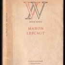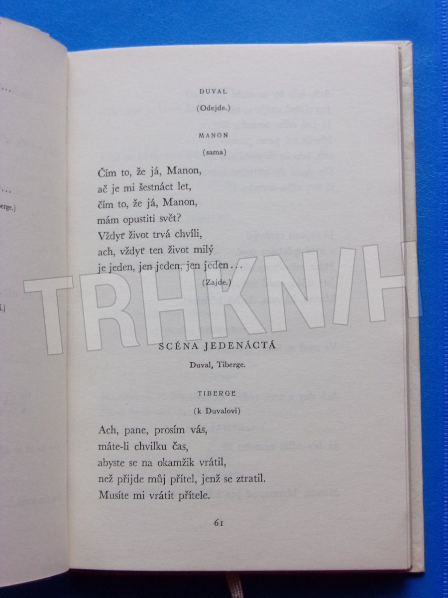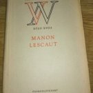 Milostný příběh abbé Prévosta proměněný V. Nezvalem v jevištní báseň, v níž jde především o rozehrání citových prožitků půvabné Manony a chudého rytíře Des Grieux. Manon, dychtivá přepychu a flirtu, přijímá obdiv a dary bohatých Duvalů a naivně si myslí, že tím pomáhá svému chudému rytíři. Přesila církevních a peněžních intrik dohání milence k deportaci za moře a k záhubě, nezabrání jim však v tom, aby svým protivníkům, kteří nepřejí jejich lásce, neunikli alespoň v okamžiku smrti