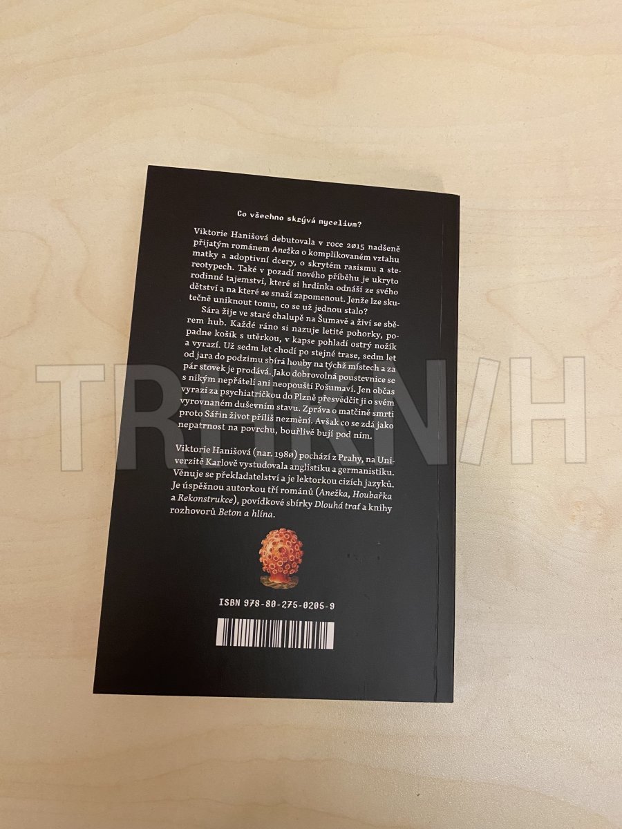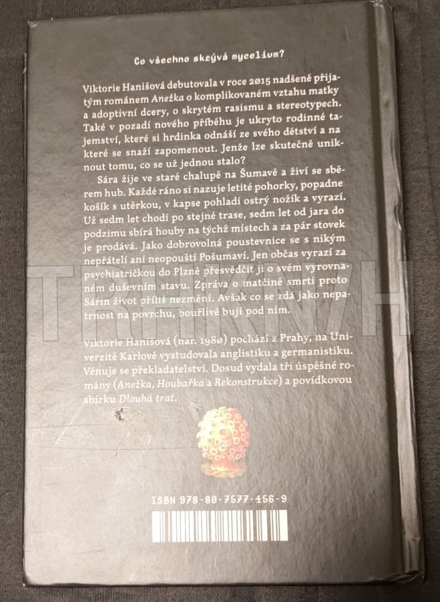 Co všechno skrývá mycelium?Viktorie Hanišová debutovala v roce 2015 nadšeně přijatým románem Anežka o komplikovaném vztahu matky a adoptivní dcery, o skrytém rasismu a stereotypech. Také v pozadí nového příběhu je ukryto rodinné tajemství, které si hrdinka odnáší ze svého dětství a na které se snaží zapomenout. Jenže lze skutečně uniknout tomu, co se už jednou stalo?Sára žije ve staré chalupě na Šumavě a živí se sběrem hub. Každé ráno si nazuje letité pohorky, popadne košík s utěrkou, v kapse pohladí ostrý nožík a vyrazí. Už sedm let chodí po stejné trase, sedm let od jara do podzimu sbírá houby na týchž místech a za pár stovek je prodává. Jako dobrovolná poustevnice se s nikým nepřátelí ani neopouští Pošumaví. Jen občas vyrazí za psychiatričkou do Plzně přesvědčit ji o svém vyrovnaném duševním stavu. Zpráva o matčině smrti proto Sářin život příliš nezmění. Avšak co se zdá jako nepatrnost na povrchu, bouřlivě bují pod ním.