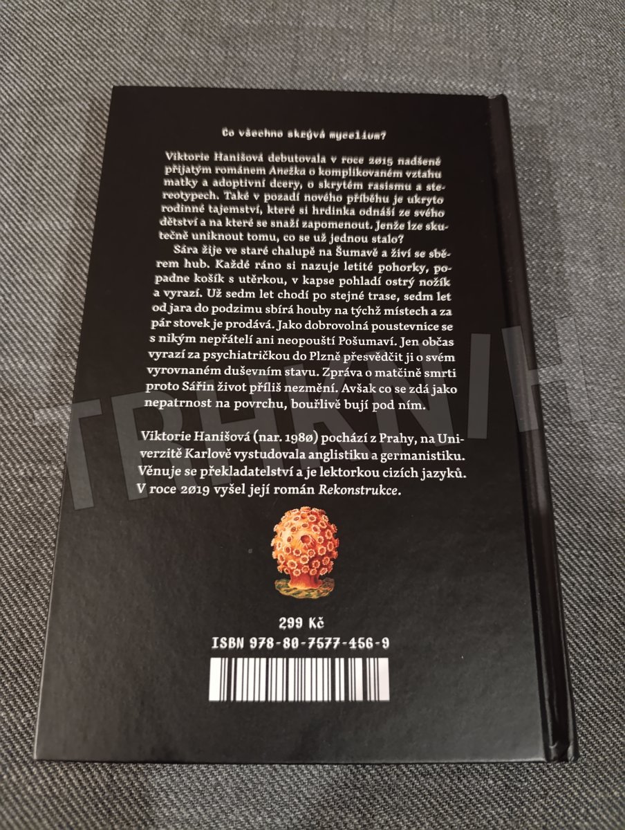 Co všechno skrývá mycelium?Viktorie Hanišová debutovala v roce 2015 nadšeně přijatým románem Anežka o komplikovaném vztahu matky a adoptivní dcery, o skrytém rasismu a stereotypech. Také v pozadí nového příběhu je ukryto rodinné tajemství, které si hrdinka odnáší ze svého dětství a na které se snaží zapomenout. Jenže lze skutečně uniknout tomu, co se už jednou stalo?Sára žije ve staré chalupě na Šumavě a živí se sběrem hub. Každé ráno si nazuje letité pohorky, popadne košík s utěrkou, v kapse pohladí ostrý nožík a vyrazí. Už sedm let chodí po stejné trase, sedm let od jara do podzimu sbírá houby na týchž místech a za pár stovek je prodává. Jako dobrovolná poustevnice se s nikým nepřátelí ani neopouští Pošumaví. Jen občas vyrazí za psychiatričkou do Plzně přesvědčit ji o svém vyrovnaném duševním stavu. Zpráva o matčině smrti proto Sářin život příliš nezmění. Avšak co se zdá jako nepatrnost na povrchu, bouřlivě bují pod ním.