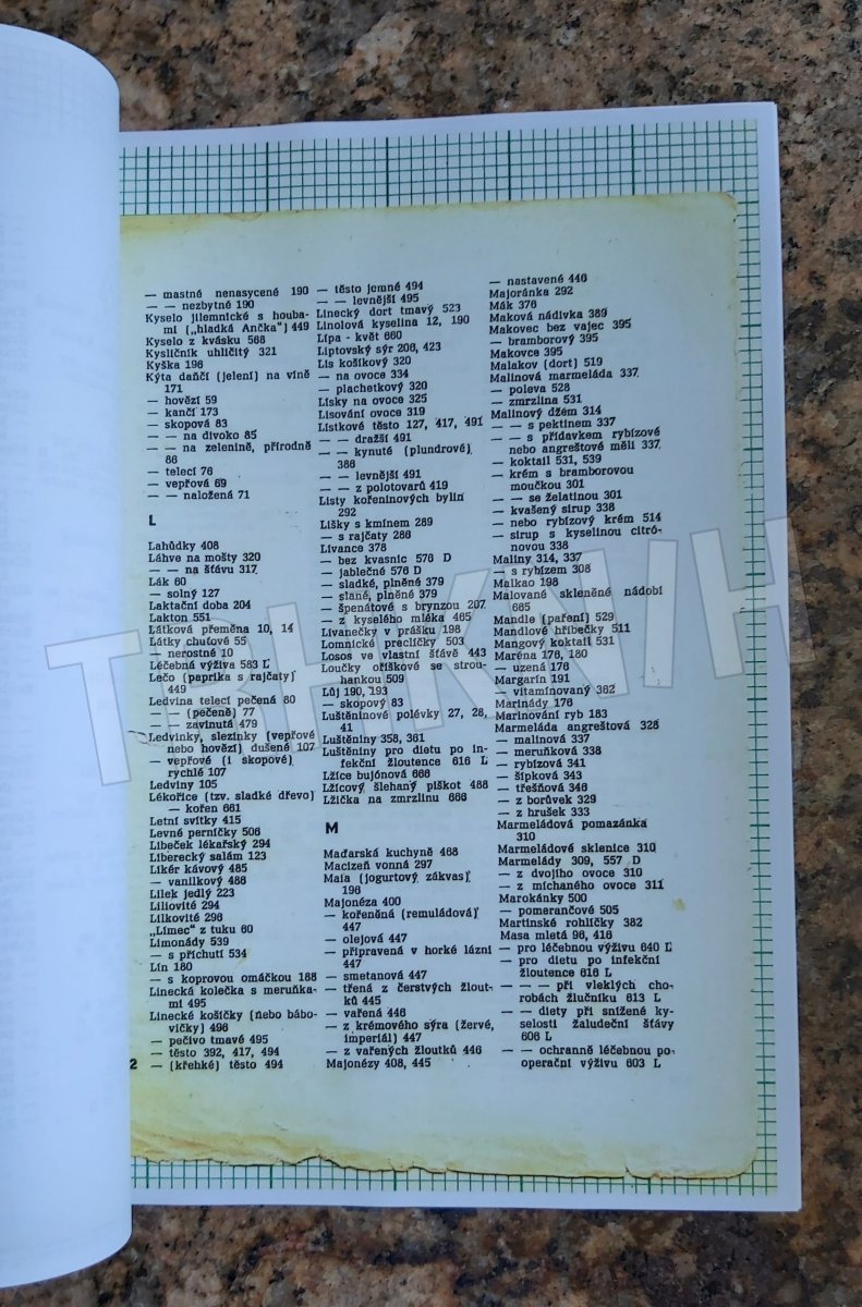 Neodborně, ale pěkně opravena. Vypadané listy ((abecední seznam receptů a uvod) jsou ve zvláštní složce okopírované. Původní jsou také přiložené.