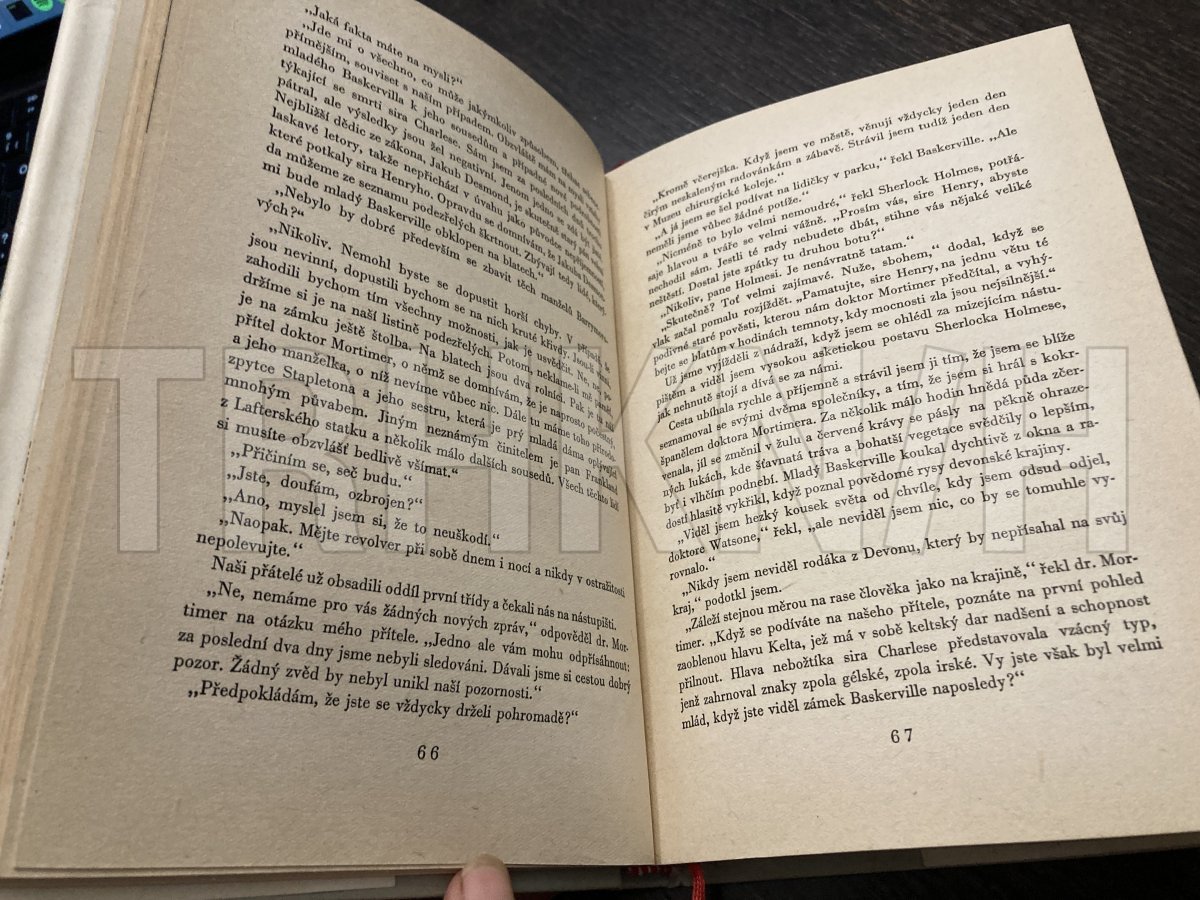Pes baskervillský : další dobrodružství Sherlocka Holmese Autor: Doyle, Arthur Conan Vydání: 3 Místo vydání: Praha Počet stran: 194 s. Rok vydání: 1966 Vazba: vázaná s obálkou Stav: dobrý, zašpiněná, roztržená obálka Nakladatel: SNDK Kategorie: Detektivk