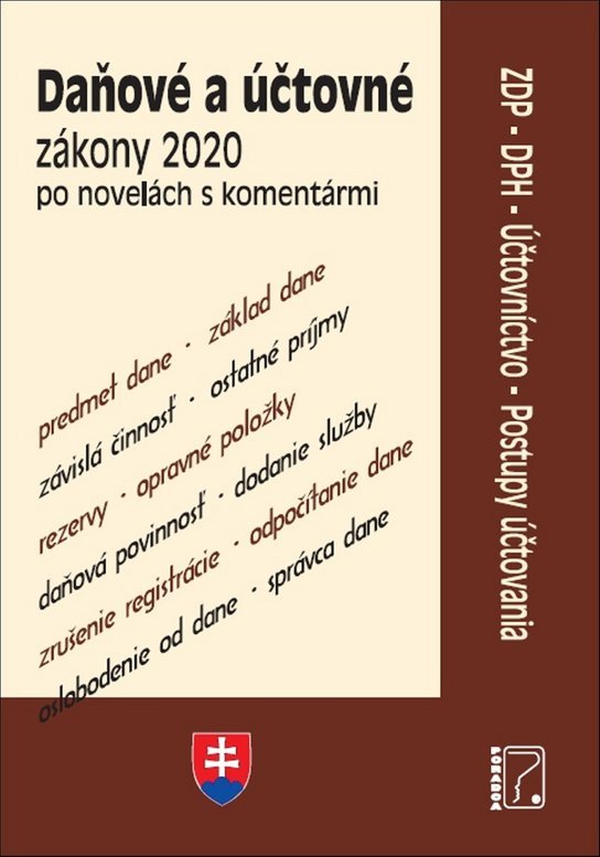 Publikácia obsahuje daňové a účtovné zákony po novelách pre rok 2020. Zákony sú publikované s komentármi renomovaných odborníkov z danej oblasti. Dôležitými informáciami osloví účtovníkov, mzdových účtovníkov, audítorov, ekonómov, podnikateľov... Zmeny v zákone o dani z príjmov sú zamerané najmä na: Podporu malých a stredných podnikov o zavedenie definície mikrodaňovníka a s ňou súvisiace zmeny v zdaňovaní tejto skupiny daňovníkov, o úpravu podmienok odpočtu daňovej straty, Znižovanie administratívneho zaťaženia daňovníkov o zavedenie automatickej registrácie správcom dane, o zjednodušenie podmienok na zahrňovanie do základu dane pri výdavkoch, ktoré sú súčasťou základu dane až po zaplatení, Zníženie administratívnej náročnosti pri zdaňovaní príjmov zo závislej činnosti o rozšírenie oslobodenia od dane pre vymedzené druhy nepeňažných príjmov, o zavedenie možnosti zamestnávateľa vystaviť a doručiť zamestnancovi po vzájomnej dohode vymedzené druhy dokladov elektronickou formou, o umožnenie zamestnancovi podať zamestnávateľovi po vzájomnej dohode žiadosť o vykonanie ročného zúčtovania preddavkov na daň elektronickou formou, o zrušenie povinnosti zamestnanca každoročne podpisovať vyhlásenie na uplatnenie nezdaniteľnej časti základu dane na daňovníka a daňového bonusu, Platenie preddavkov na daň z príjmov o zvýšenie hranice pre povinnosť platenia preddavkov a zjednodušenie výpočtu poslednej známej daňovej povinnosti, o zjednodušenie spôsobu platenia preddavkov na daň z príjmov zo závislej činnosti v prípade neexistencie zamestnávateľa, ktorý je platiteľom dane, o zjednotenie lehoty na vyrovnanie preddavkov na daň platených do lehoty na podanie daňového priznania novovzniknutého daňovníka s ostatnými daňovníkmi, Podporu automobilového priemyslu o zvýšenie sumy oslobodeného nepeňažného plnenia zamestnanca z dôvodu zabezpečenia ubytovania, o zvýšenie podpory podnikového výskumu a vývoja prostredníctvom odpočtu (výdavkov) nákladov vynaložených na výskum a vývoj, o zavedenie samostatnej odpisovej skupiny pre elektromobily. Novelou zákona o dani z pridanej hodnoty sa zavádzajú nasledovné legislatívne úpravy: o zjednodušenie obchodovania s tovarom v rámci tzv. call-off stock úpravy medzi členskými štátmi, o určenie miesta dodania tovaru s prepravou, uskutočňovanou tzv. sprostredkujúcim subjektom alebo na jeho účet, v tzv. reťazových transakciách v rámci EÚ, o doplnenie, že identifikačné číslo pre DPH nadobúdateľa tovaru, pridelené iným členským štátom ako je členský štát začatia prepravy tovaru, predstavuje hmotnoprávnu podmienku pre oslobodenie dodania tovaru do iného členského štátu, o zníženie sadzby DPH na noviny, časopisy a periodiká na 10 %, o zníženie sadzby DPH na zdravé potraviny na 10 %, o reťazové obchody prvýkrát v zákone o DPH, o zavedenie režimu call-off stock, o nadobudnutie tovaru v tuzemsku z iného členského štátu v osobitnom prípade - znenie ustanovenia § 11a, o určenie základu dane pri bezodplatnom dodaní dlhodobého majetku do 1 700 eur, o doplnenie hmotnoprávnej podmienky pre oslobodenie dodania tovaru do iného členského štátu, o mechanizmus opravy odpočítanej dane zo služieb, ktoré boli vykonané na investičnom majetku, o úprava odpočítanej DPH pri hnuteľnom investičnom majetku predanom do 5 rokov od jeho obstarania.