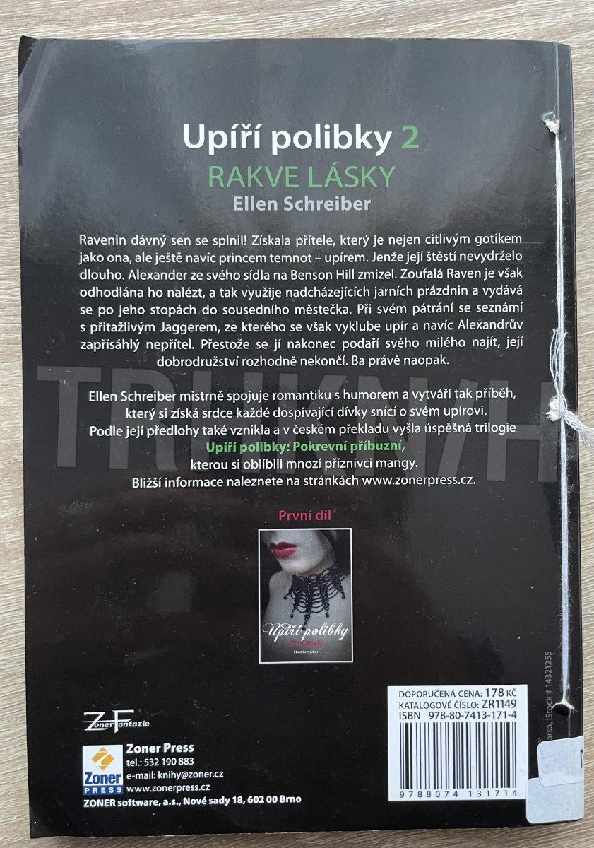 Může láska k upírovi přestát nástrahy světa? Ravenin dávný sen se konečně splnil! Našla si přítele, který je nejen citlivým gotikem jako ona, ale ještě navíc i princem temnot - upírem, o němž vždycky snila. Jenže jejich štěstí nevydrželo dlouho. Alexander ze svého sídla na Benson Hill zmizel. Zoufalá Raven je však odhodlána ho nalézt, a tak využije nadcházejících jarních prázdnin a vydává se po jeho stopách do sousedního městečka. Při svém pátrání se seznámí s přitažlivým Jaggerem, ze kterého se záhy vyklube upír a navíc Alexandrův zapřísáhlý nepřítel. Raven se vrací se do Dullsville a přestože se jí nakonec podaří svého milého najít, její dobrodružství rozhodně nekončí. Právě naopak. Autorka románu Ellen Schreiber mistrně spojila romantiku s humorem a vytvořila tak příběh, který si získá srdce každé dospívající dívky snící o svém upírovi. Podle její předlohy také vznikla úspěšná trilogie Upíří polibky: Pokrevní příbuzní, kterou si zamilovali mnozí příznivci mangy i upírů.