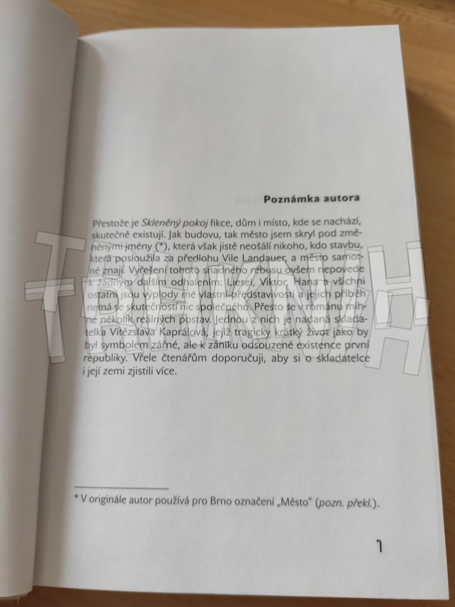 Román inspirovaný skutečným osudem vily Tugendhat, který zaujme od první věty. Na pozadí příběhu jejích majitelů zrcadlí tragédii celého českého národa. Vysoko na kopci nad Brnem ční zázračný dům. Postaven na míru židovsko-křesťanskému novomanželskému páru vyzařuje bohatství, sebevědomí, krásu a majestátnost. Avšak jen do chvíle, než do země vstoupí nacistické vojsko a manželé musí vilu i zemi opustit. Život vily se s odchodem jejích majitelů ale nezastaví. Přechází z jedněch rukou do druhých, z českých do nacistických, pak do sovětských až se opět vrátí do majetku československého státu. Krystalická dokonalost skleněného pokoje přitom zasahuje nesmírnou gravitací každého, kdo se dostane do jeho blízkosti. - Nominace na Man Booker Prize 2009.