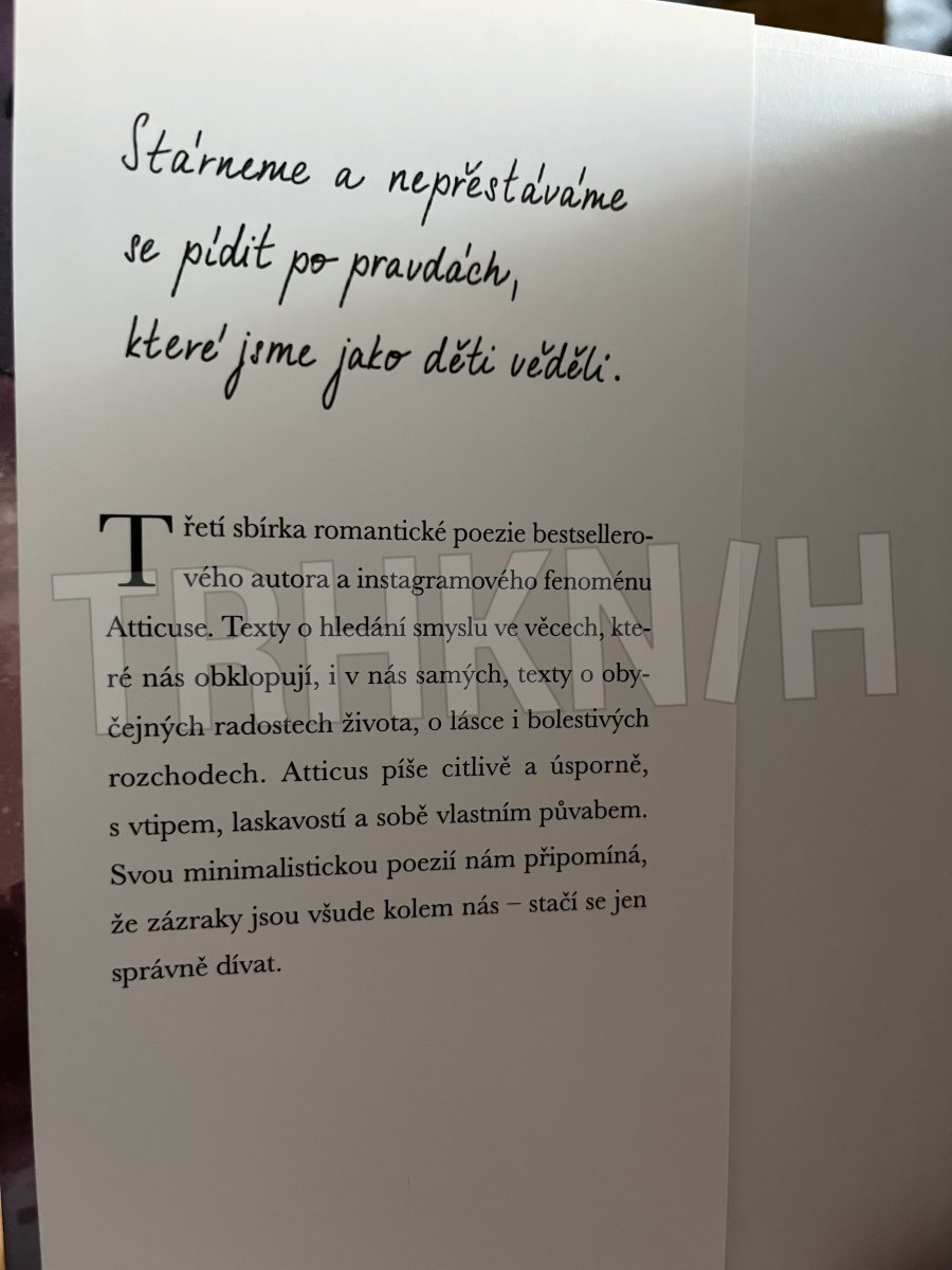 Texty o hledání smyslu ve věcech, které nás obklopují, i v nás samých, texty o obyčejných radostech života, o lásce i bolestivých rozchodech. Atticus píše citlivě a úsporně, s vtipem, laskavostí a sobě vlastním půvabem. Svou minimalistickou poezií nám připomíná, že zázraky jsou všude kolem nás - stačí se jen správně dívat.