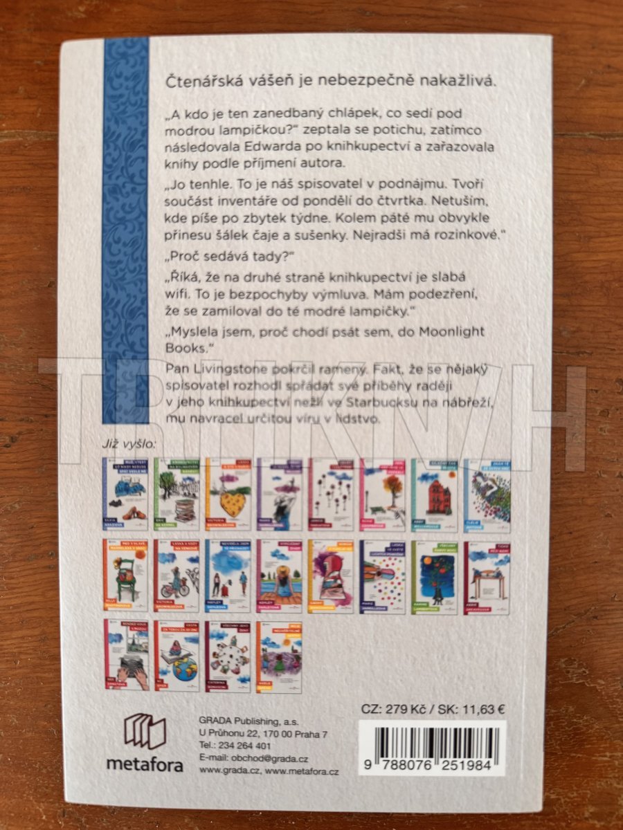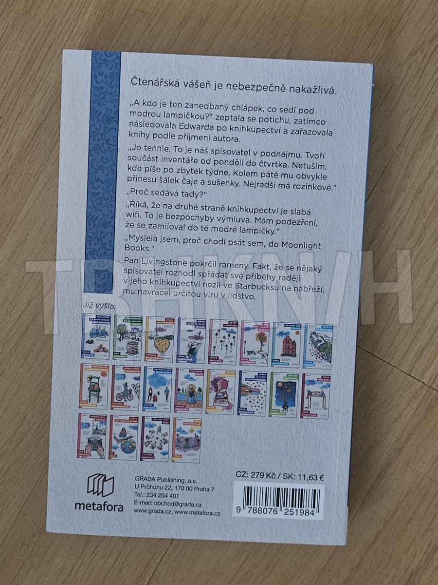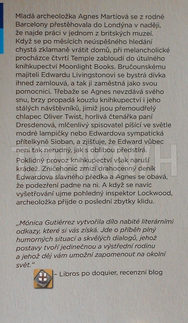 Mladá archeoložka Agnes Martíová se z rodné Barcelony přestěhovala do Londýna v naději, že najde práci v jednom z britských archeologických muzeí. Když se však po několika měsících neúspěšného hledání chystá zklamaně vrátit domů, při melancholické procházce čtvrtí Temple zabloudí do útulného knihkupectví Moonlight Books. Bručounskému majiteli Edwardu Livingstonovi se bystrá dívka ihned zamlouvá, a tak ji zaměstná jako svou pomocnici. Třebaže se Agnes nevzdává svého archeologického snu, brzy propadá kouzlu onoho obchodu i jeho stálých návštěvníků, jako je přemoudřelý chlapeček Oliver Twist, horlivá čtenářka paní Dresdenová, mlčenlivý spisovatel píšící ve světle modré lampičky nebo Edwardova sympatická přítelkyně, nakladatelka Sioban, a zjišťuje, že Edward není zas takový misantrop, za jakého se vydává
