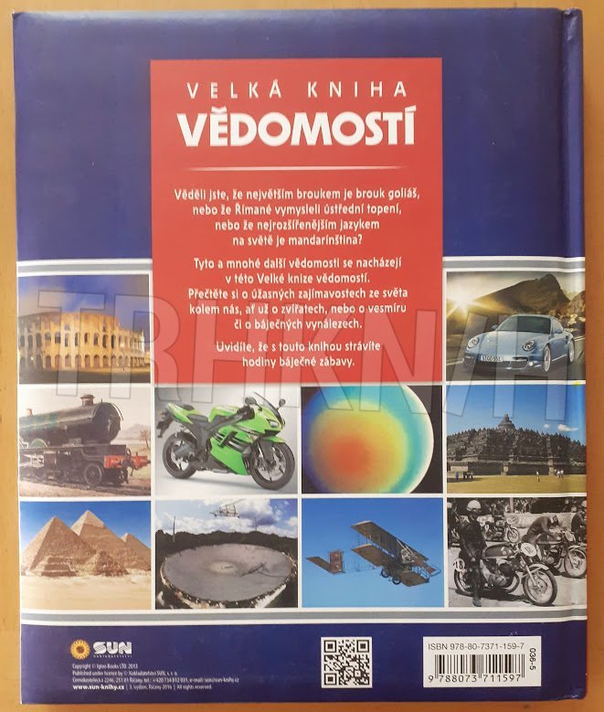 Tradiční, bohatě ilustrovaná dětská encyklopedie rozčleněná do čtyř kapitol: Svět zvířat, Příroda, Umění a zábava a Technologie. Pro děti od 10 let.Velká kniha vědomostí přináší tradiční encyklopedický přehled základních znalostí o světě kolem nás. Autoři vybrali dětským čtenářům přitažlivá témata, která pak rozčlenili do čtyř kapitol tak, aby vyváženým způsobem popsali nejen naše životní prostředí, ale i moderní svět, který nás v posledních desetiletích obklopuje čím dál tím těsněji. Od zvířat se tak dostaneme až k moderním technologiím a zábavě. Nechybí samozřejmě velké, barevné fotografie a krátké, populárně-naučné texty. Každé téma je navíc okořeněno nějakým zvláště zajímavým faktem.