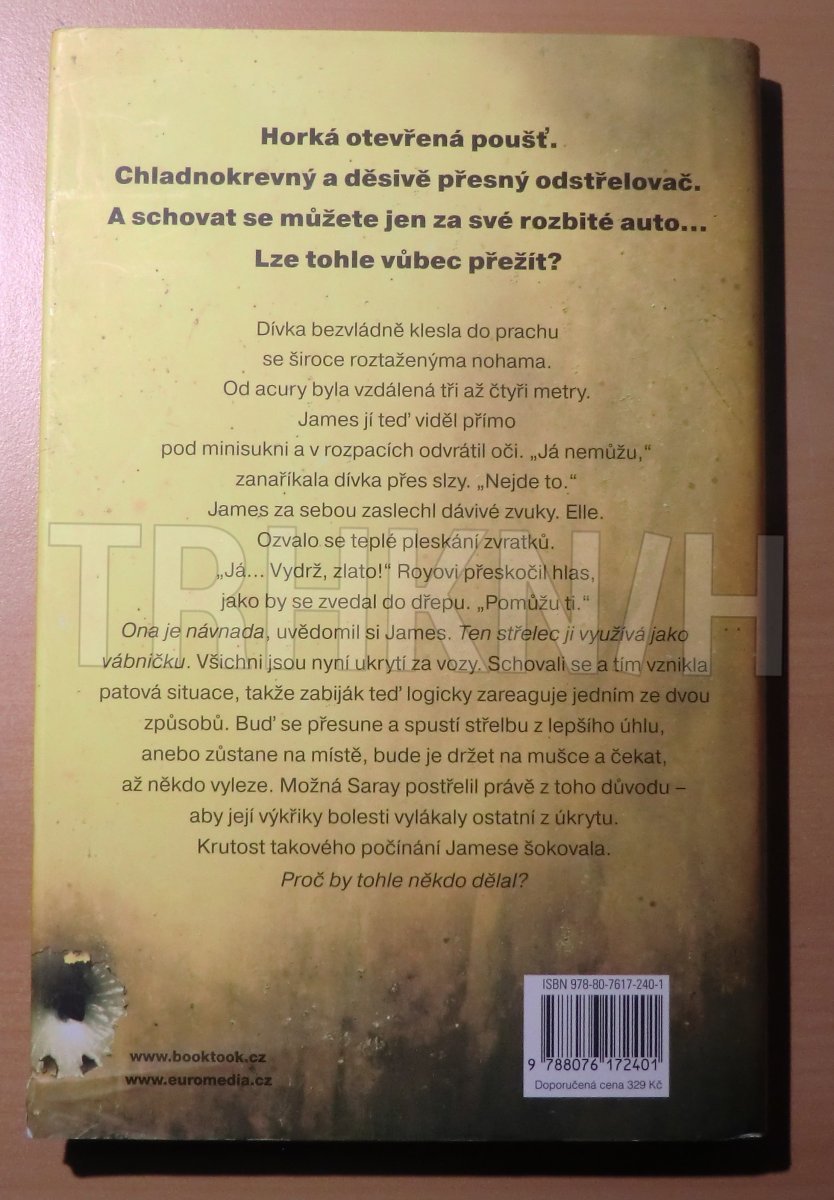 Další kniha od Taylora Adamse, autora strhujícího thrilleru Není úniku, mistra příběhů o mezních situacích, napínavých v každé vteřině a dramatických až do překvapivého závěru. Mladí manželé James a Elle Eversmanovi projíždějí Mohavskou pouští vstříc novému životu. Nečekaně se jim porouchá auto a oni uvíznou uprostřed pustiny, bez vody, mobilního signálu a jakékoli šance na záchranu. Z více jak kilometrové vzdálenosti je drží na mušce chladnokrevný a děsivě přesný odstřelovač. James s Elle jsou uvězněni za rozbitým autem a ze všech stran je obklopuje jen otevřené prostranství. Není kam se schovat ani kam utéct a nikdo nepřichází na pomoc. Dá se tohle vůbec přežít?