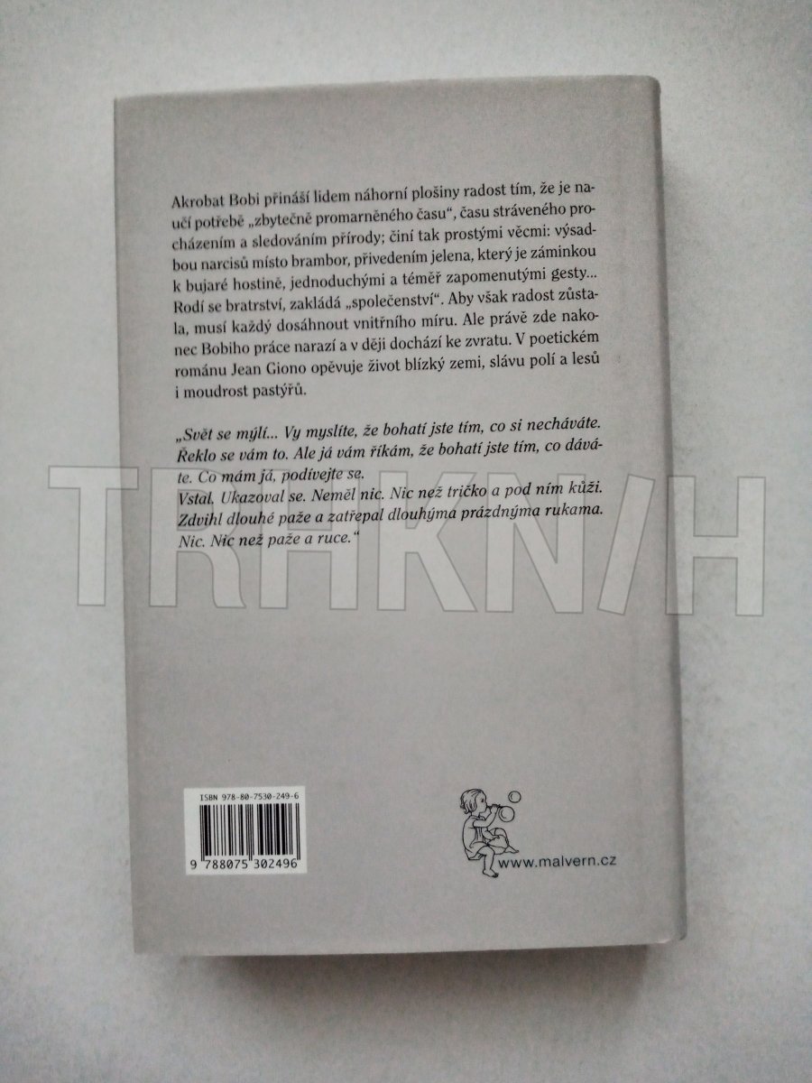 Akrobat Bobi přináší lidem náhorní plošiny radost tím, že je naučí potřebě !"zbytečně promarněného času", času stráveného procházením a sledováním přírody; činí tak prostými věcmi: výsadbou narcisů místo brambor, přivedením jelena, který je záminkou k bujaré hostině, jednoduchými a téměř zapomenutými gesty... Rodí se bratrství, zakládá "společenství". Aby však radost zůstala, musí každý dosáhnout vnitřního míru. Ale právě zde nakonec Bobiho práce narazí a v ději dochází ke zvratu. V poetickém románu Jean Giono opěvuje život blízký zemi, slávu polí a lesů i moudrost pastýřů.