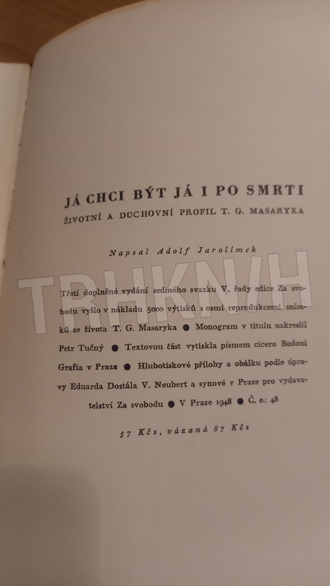 Rok vydání - 1948. Vázaná, 133 stran, formát 12x21 cm, 8 obrazových příloh, vlepená fotografie Masaryka, vpisky a podtrhananý text tužkou, soukromá plátěná převazba s koženým hřbetem. Velmi pěkný stav - viz foto.