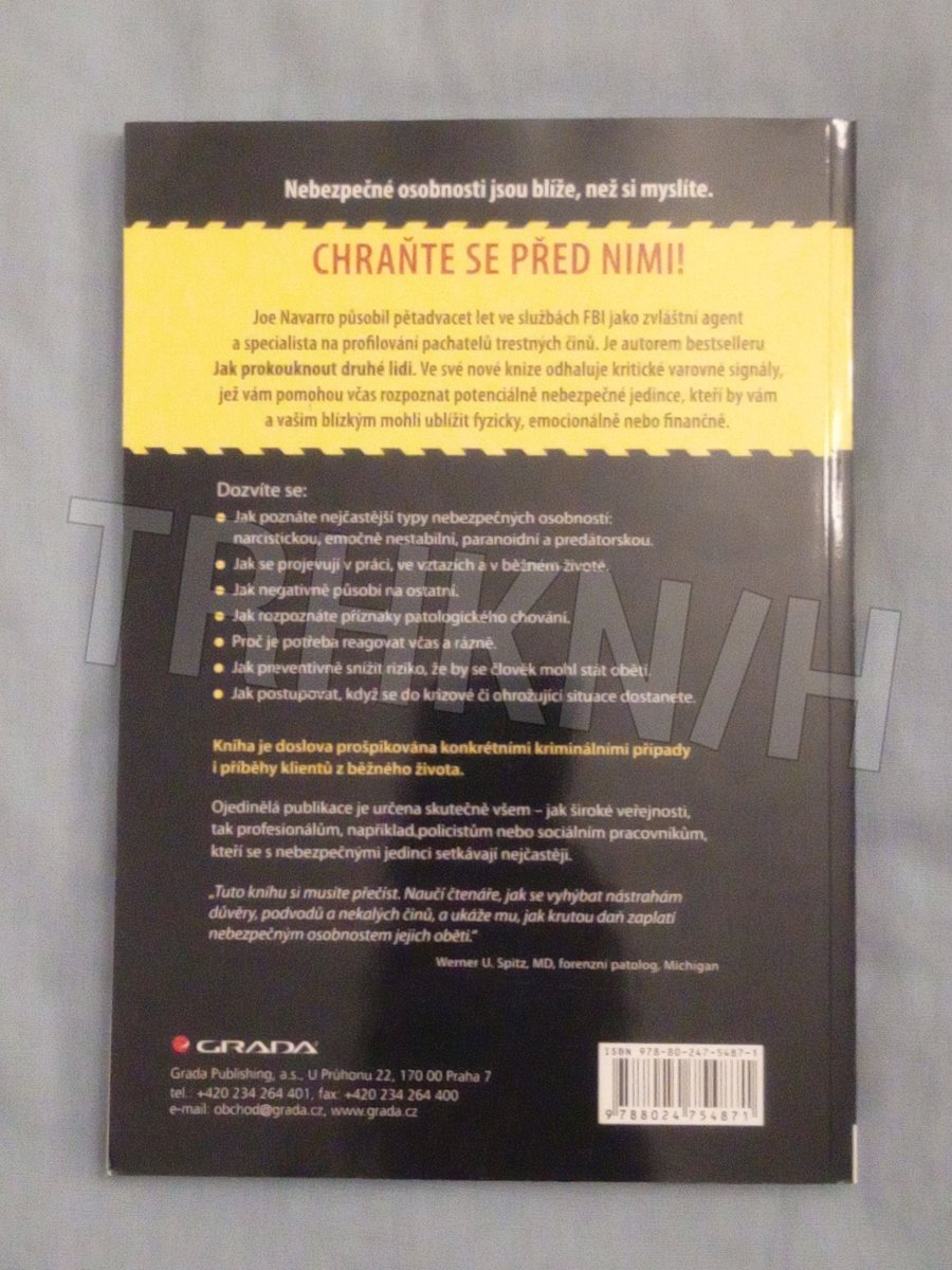 Joe Navarro působil pětadvacet let ve službách FBI jako zvláštní agent a specialista na profilování pachatelů trestných činů. Je autorem bestselleru „Jak prokouknout druhé lidi“. Ve své nové knize odhaluje kritické varovné signály, jež vám pomohou včas rozpoznat potenciálně nebezpečné jedince, kteří by vám a vašim blízkým mohli ublížit fyzicky, emocionálně nebo finančně. Dozvíte se: - Jak poznáte nejčastější typy nebezpečných osobností - narcistickou, emočně nestabilní, paranoidní a predátorskou. - Jak se projevují v práci, ve vztazích a v běžném životě. - Jak negativně působí na ostatní. - Jak rozpoznáte příznaky patologického chování. - Proč je potřeba reagovat včas a rázně. - Jak preventivně snížit riziko, že by se člověk mohl stát obětí...