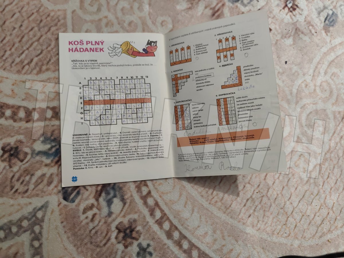 stav: Velice nádherný stav, křížovka vyplněna velká obyčejnou tužkou, malé křížovky nevyplněny, jedinou chybičkou na úplné kráse je natržení obálky ve hřbetu nahoře cca 3 cm