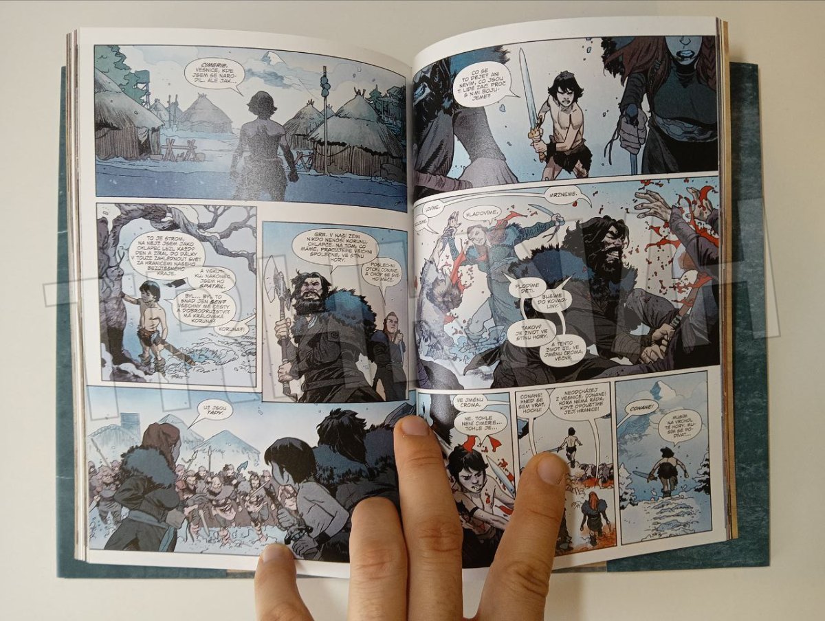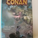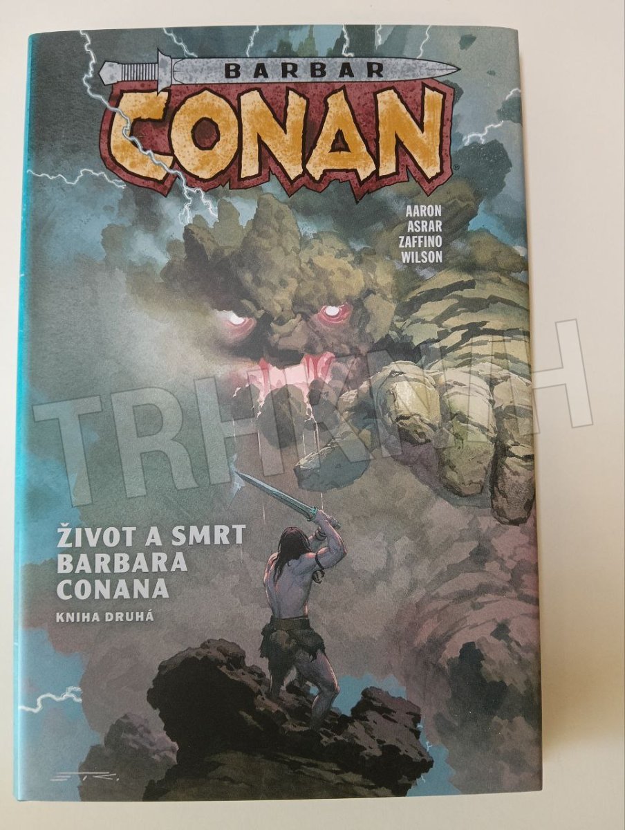 Z věku nepředstavitelných divů přichází... Conan, černovlasý Cimeřan, podmračený, s mečem v ruce. Zloděj, drancíř a zabiják, jenž poznal hluboký zármutek i bezuzdné veselí a který neváhal svýma bosýma nohama v prostých sandálech rozdrtit i ty nejmocnější trůny světa. Kromě žejdlíku chutného piva, žáru bitvy či lesku zlatých pokladů uchvátily Conana nejednou také krásné ženy. A právě této slabosti využila podlá Karmínová čarodějka – jež se kvůli dosažení svého cíle nezdráhá ničeho! Šelmy minulosti vystrkují ostré tesáky a barbar stane tváří v tvář nezvratnému osudu – avšak co bude následovat? Co když na něj čeká sám... Crom?! Bohovi je však osud lidí dočista ukradený – leda by ho někdo přinutil, aby změnil názor. Připravte se na osudovou bitvu, která nemá obdoby!