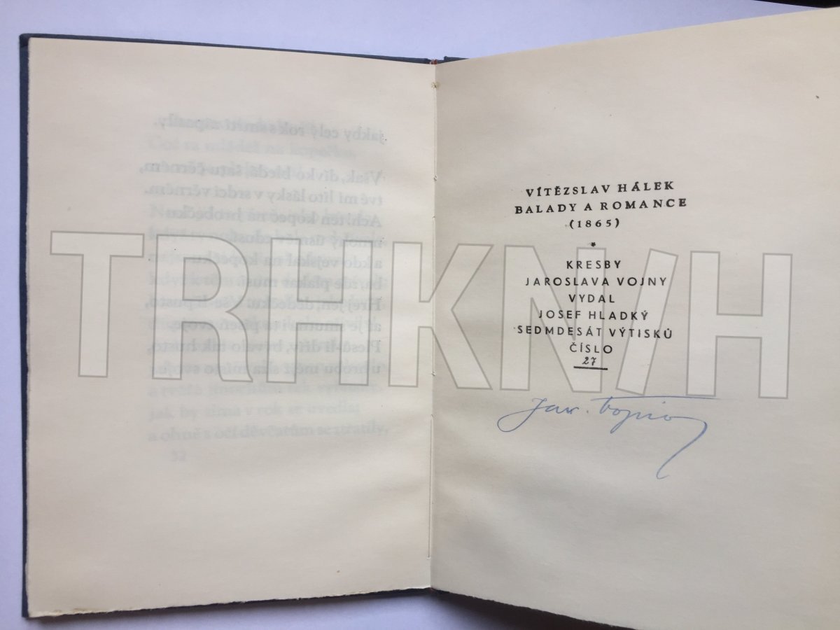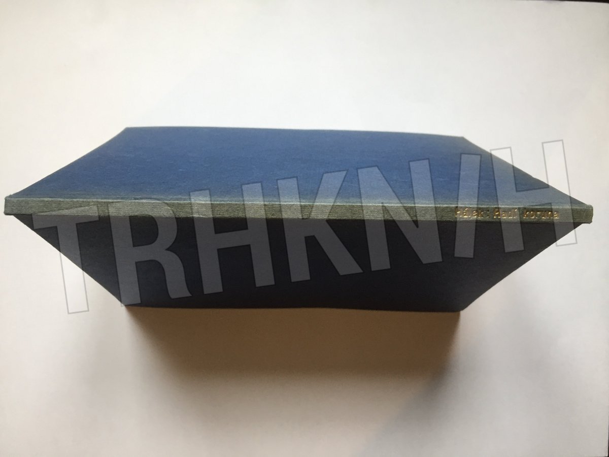 Pevná vazba s potiskem ve zlaté barvě na hřbetě. Kromě nepatrného vyblednutí okrajů desek vynikající stav, neopotřebená. Ze 70 číslovaných výtisků výt. č. 27 s podpisem autora kreseb J. Vojny.