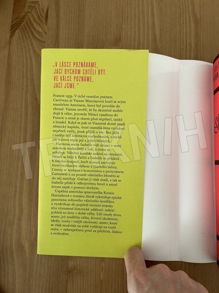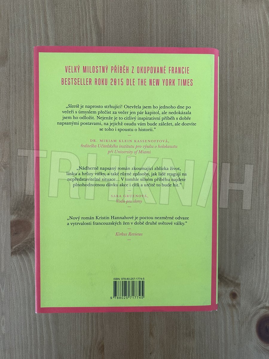 Francie 1939. V tiché vesničce jménem Carriveau se Vianne Mauriacová loučí se svým manželem Antoinem, který byl povolán do zbraně. Vianne nevěří, že by skutečně mohlo dojít k válce, jenomže Němci vpadnou do Francie a země je rázem plná nepřátel, tanků a bojových letadel. Když se pak ve Viannině domě usadí německý kapitán, musí osamělá žena vycházet nepříteli vstříc, jinak přijde o vše. Bez jídla i naděje čelí nelehkým rozhodnutím, v nichž jde o život či smrt nejen její a jejích blízkých. Viannina sestra Isabelle vidí situaci v zemi mnohem realističtěji a tuší, k čemu se schyluje. Válečný konflikt nabírá na intenzitě, Němci se blíží k Paříži a Isabelle se přidává k tisícům krajanů, kteří si musí zachránit život bezhlavým útěkem z hlavního města. Cestou se seznámí s komunistou a partyzánem Gaëtanem a na pozadí válečného běsnění se do něj zamiluje. Gaëtan ji však zradí, a tak se Isabelle přidá k odbojovému hnutí a smysl života najde v pomoci druhým. Úspěšná americká spisovatelka Kristin Hannahová v románu Slavík vykresluje epické panorama světového válečného konfliktu a vyzdvihuje do popředí intimní stránky této významné historické události: nabízí pohled na ženy v době války. Líčí osudy dvou sester, jež rozdělila válka, životní zkušenost, ideály, touhy i vnější okolnosti, sester, které se však nezávisle na sobě vydávají na tutéž cestu – nebezpečnou pouť za přežitím, láskou a svobodou.
