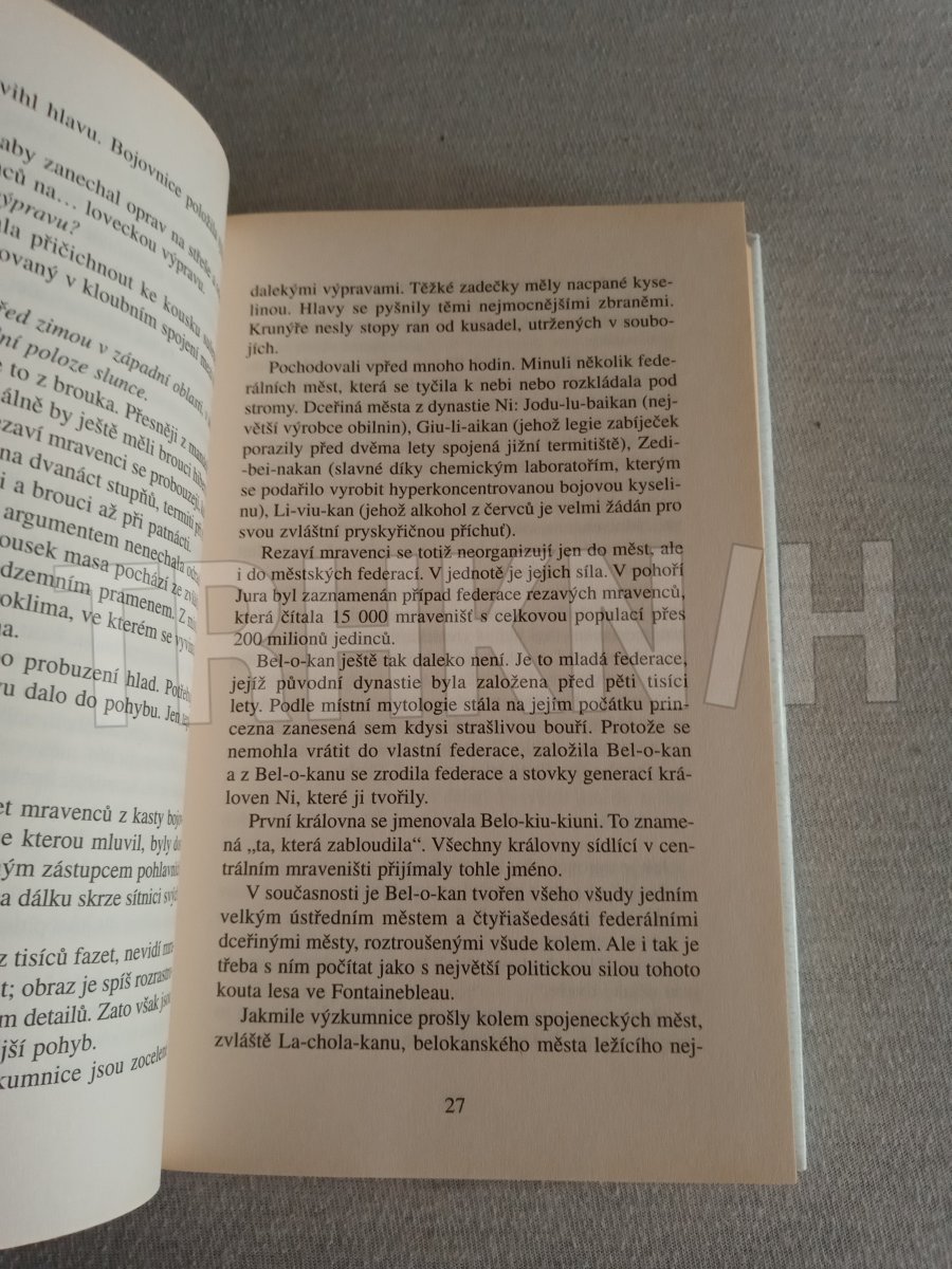 Dávejte pozor, kam šlapete! Během několika vteřin, které potřebujete k přečtení tohoto odstavce, se narodí 40 lidí… a 700 milionů mravenců. Malí, pro nás takřka neviditelní, a přesto úchvatní tvoři vytvořili od doby, kdy se před stovkou milionů let na Zemi objevili, zcela dokonalou a všestranně fungující civilizaci. Budují města a federace, bojují o území, společnými silami odrážejí útoky vetřelců a predátorů. Zakládají houbová políčka nebo mšičí farmy a svá hnízda dokážou utkat z listí. Vyznávají kastovní systém a některé druhy si otrokářským způsobem podrobují jiné. Přestože představivost lidí vždy s oblibou hledala paralelní světy po nejrůznějších koutech vesmíru, na fantastickou existenci těch, kteří žijí v poloskrytu pod našima nohama, se zapomínalo. Jsou mravenci anarchisté, roajalisté anebo se jejich organizace blíží totalitnímu zřízení? Jak chápou čas? Co o nich vlastně víme? A vědí oni o nás? Werberův román Mravenci bývá právem označován jako realistická sci-fi: to nejúžasnější je na něm právě to, co je skutečné. Po jeho přečtení už nikdy nebudete vnímat svět tak jako dosud - stejně jako hrdina knihy, nezaměstnaný pařížský zámečník Jonathan Wells, který po svém excentrickém strýci zdědil suterénní byt a tajemné varování: Hlavně nikdy nechoď do sklepa!