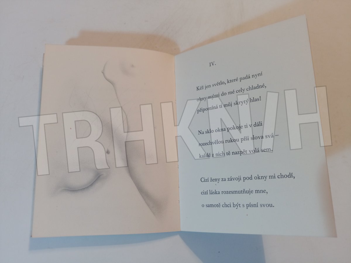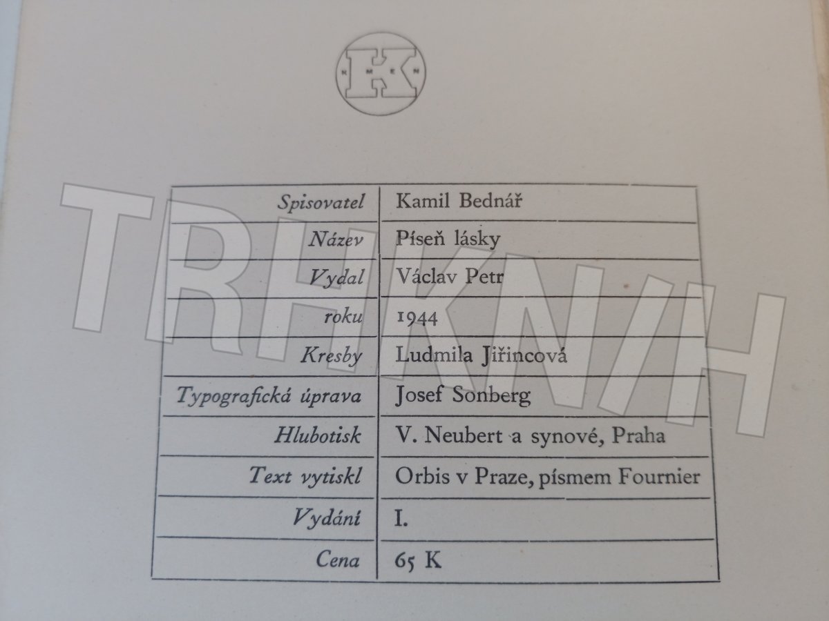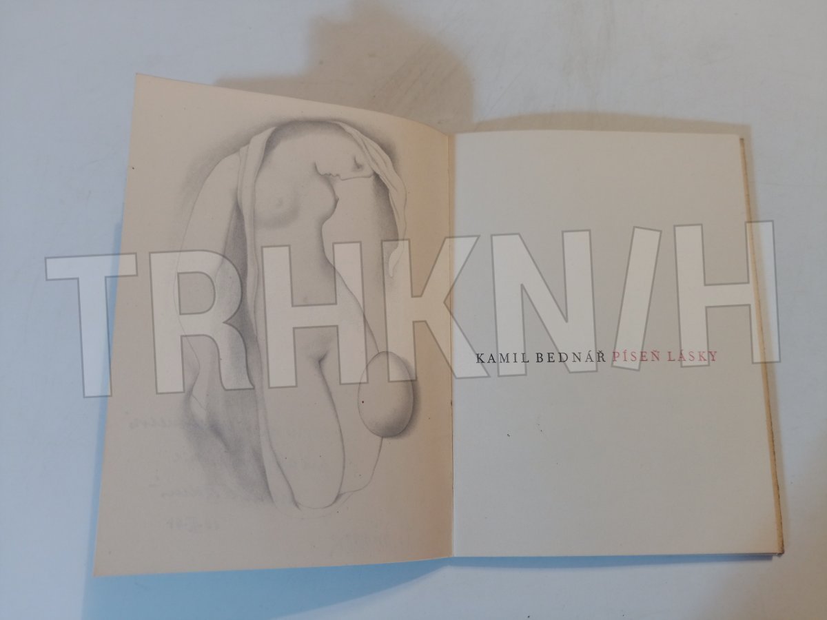 Píseň lásky Autor: Bednář, Kamil Místo vydání: V Praze Počet stran: 30 s. Rok vydání: 1944 Vazba: brožovaná Stav: trochu žluté flíčky, jinak dobrý Nakladatel: Václav Petr Kategorie: Bibliofilie Edice, série: kniha Vytvořeno: 2018-10-01 18:42:25 Naposledy