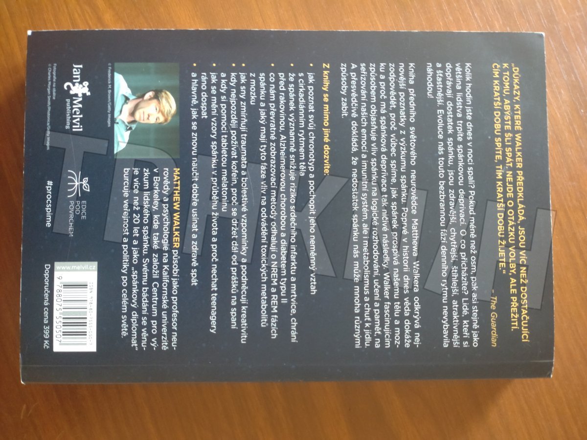 Kolik hodin jste dnes v noci spali? Pokud méně než osm, pak asi stejně jako většina lidstva trpíte spánkovou deprivací. O co přicházíte? Lidé, kteří si dopřávají dostatek spánku, jsou zdravější, chytřejší, štíhlejší, atraktivnější a šťastnější. Evoluce nás touto bezbrannou fází denního rytmu nevybavila náhodou! Kniha předního světového neurovědce Matthewa Walkera odkrývá nejnovější poznatky z výzkumu spánku. Poprvé v historii dnes věda dokáže zodpovědět, proč vůbec spíme, jak spánek prospívá našemu tělu a mozku a proč má spánková deprivace tak ničivé následky. Walker fascinujícím způsobem objasňuje vliv spánku na logické rozhodování, učení a paměť, na seřizování našich emocí a imunitní systém, ale i metabolismus a chuť k jídlu. A přesvědčivě dokládá, že nedostatek spánku nás může mnoha různými způsoby zabít.