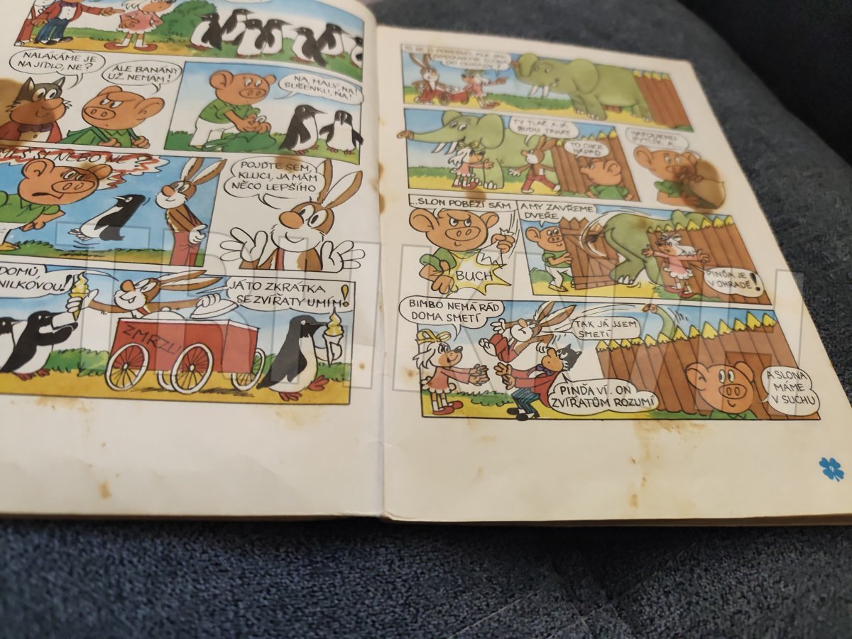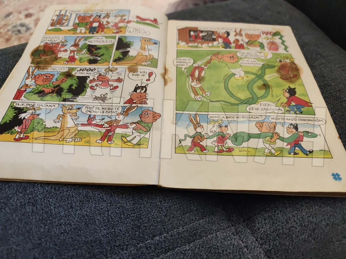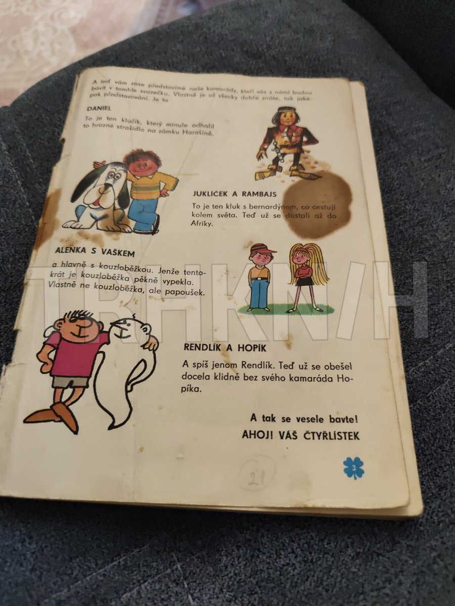 Velmi starý čtyřlístek číslo 21 bohužel bez obálky na třetí stránce flek který sekl až po stránku číslo 11 zadní strana křížovky luštěné hřbet obálky flek časopis drží bez lepenky stav viz fotografie stáří odpovídá opotřebování časopisu