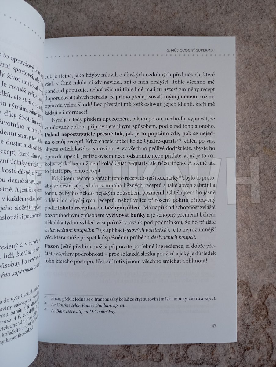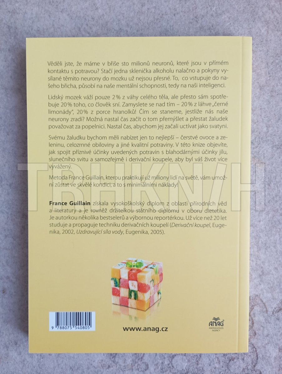 Dbejte o svou stravu, mozek se vám za to odmění.To, co se děje v našem žaludku, ovlivňuje naše duševní schopnosti a inteligenci. Náš mozek váží pouhá 2 % z celkové tělesné hmotnosti, ale sám zhltá 20 % toho, co sníme. Myslete na to: 20 % z láhve Coca-Coly, 20 % z hranolek! Co se stane, když nás neurony v průběhu cesty opustí? Je čas zamyslet se, přestat považovat žaludek za popelnici a mít ho za svatyni. Měli bychom našemu žaludku nabízet jen to nejlepší, ovoce, zeleninu, cereálie, kvalitní potraviny.Metoda France GuillainNa rozdíl od toho, co nám všude říkají, jíst zdravě není drahé! Najdete zde, jak spojit výhody této stravy s blahodárností jílu, slunečního svitu a samozřejmě „derivační koupele“ (bain dérivatif), aby byl váš život harmoničtější. Metoda světoznámé France Guillain, kterou již používají miliony lidí na celém světě, vám pomůže udržet se v dobré kondici za málo peněz!