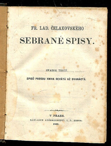 Praha: I.L. Kober, 1877. Strany 499 s. Stav: chybí hřbet desek, flíčky na stránkách dané stářím, jinak pěkný stav. Vazba: převazba