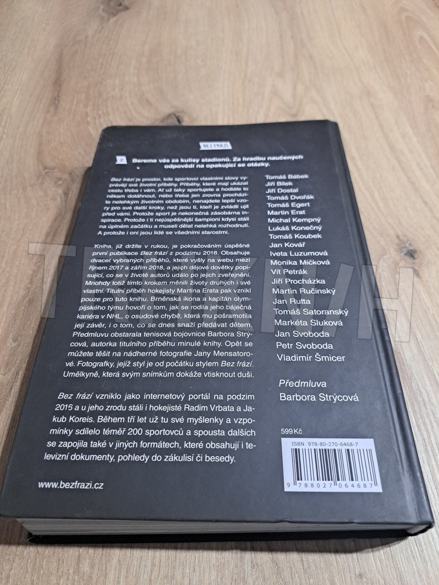 Životní příběhy sportovců jejich vlastními slovy. Když sportovci mluví bez frází, je co poslouchat… Tato kniha je pokračováním úspěšné první publikace z podzimu 2018. Obsahuje dvacet vybraných příběhů, které vyšly na webovém portálu Bez frází mezi říjnem 2017 a zářím 2018, a jejich dějové dovětky, popisující, co se s autory událo po jejich zveřejnění. Mnohdy totiž tímto krokem měnili životy druhých i své vlastní. Titulní příběh hokejisty Martina Erata pak vznikl pouze pro tuto knihu. Brněnská ikona a kapitán olympijského týmu v něm hovoří o tom, jak se rodila jeho výjimečná kariéra v NHL, o osudové chybě, která mu pošramotila její konec, i o tom, co se dnes snaží předávat dětem. Předmluvu obstarala Barbora Strýcová, tvář první knihy.