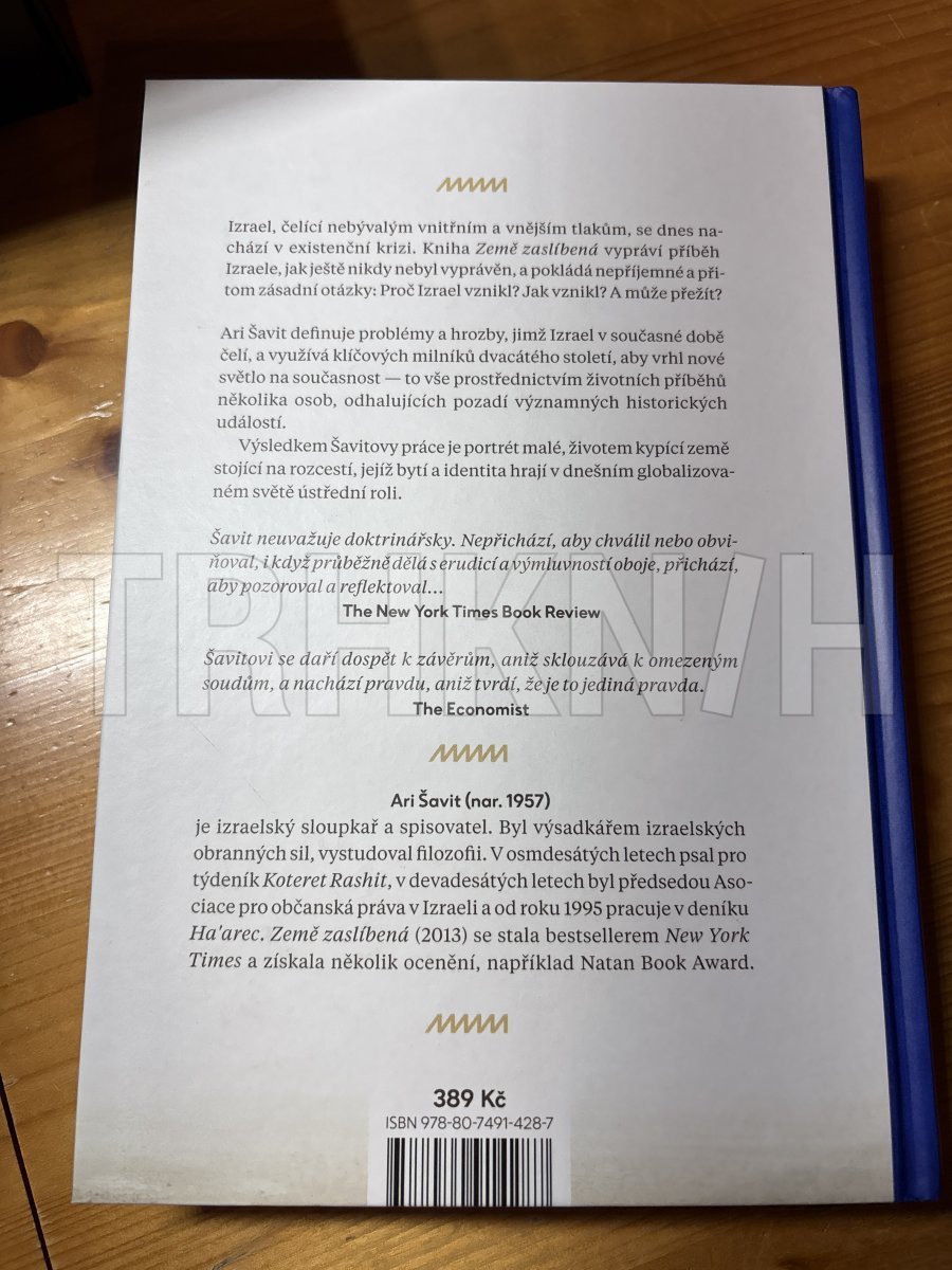 Izrael, čelící nebývalým vnitřním a vnějším tlakům, se dnes nachází v existenční krizi. Kniha Země zaslíbená vypráví příběh Izraele, jak ještě nikdy nebyl vyprávěn, a pokládá nepříjemné a přitom zásadní otázky: Proč Izrael vznikl? Jak vznikl? A může přežít? Ari Šavit definuje problémy a hrozby, jimž Izrael v současné době čelí, a využívá klíčových milníků dvacátého století, aby vrhl nové světlo na současnost — to vše prostřednictvím životních příběhů několika osob, odhalujících pozadí významných historických událostí. Výsledkem Šavitovy práce je portrét malé, životem kypící země stojící na rozcestí, jejíž bytí a identita hrají v dnešním globalizovaném světě ústřední roli.