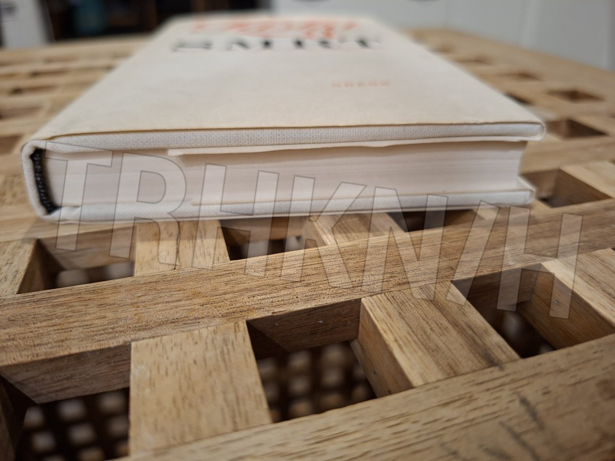 Kniha je vázaná s přebalem. Přebal je na hřbetu dost zažloutlý, je na něm několik rýh, dole na hřbetu je přebal natržený, zmáčklý.