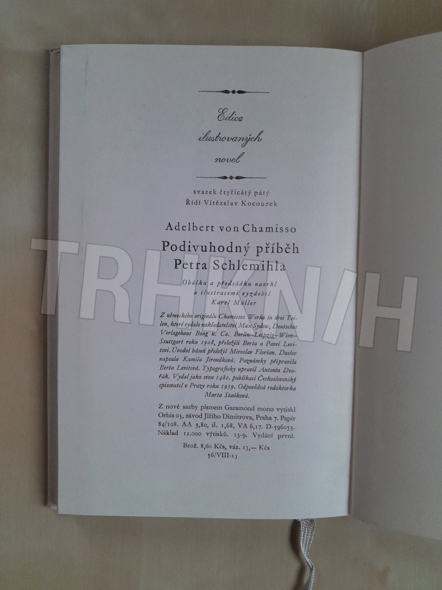 [Autor:] Adelbert von Chamisso, [pseud.] ; Z něm. orig. Chamissos Werke in drei Teilen [Peter Schlemihls wundersame Geschichte] přel. Berta a Pavel Levitovi ; Úv. báseň přel. Miroslav Florian ; Doslov: Kamila Jiroudková ; [Barev.] il. Karel Müller