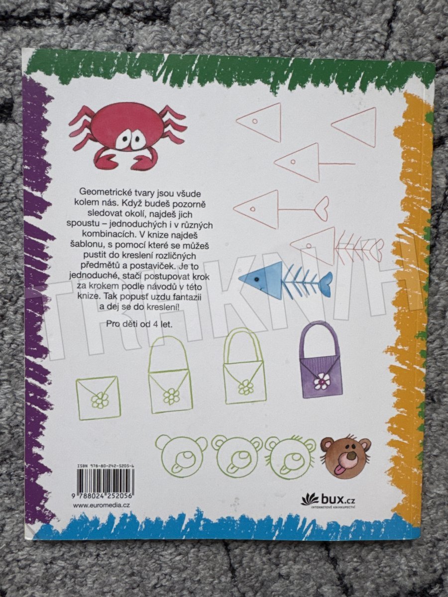 Další knížka z oblíbené řady, která seznamuje nejmenší děti se základy výtvarné výchovy. Kluci i holčičky si mohou doplnit i samostatně vytvořit spoustu vtipných obrázků pomocí poznání základních geometrických tvarů. Ty jsou všude kolem nás. Když budou děti pozorně sledovat okolí, najdou jich spoustu – jednoduchých i v různých kombinacích. Kniha obsahuje navíc šablonu, která dětem pomůže. Originální návody, jejichž pomocí dokáže stvořit malé „umělecké dílo“ i úplný začátečník, ocení i učitelé a rodiče.