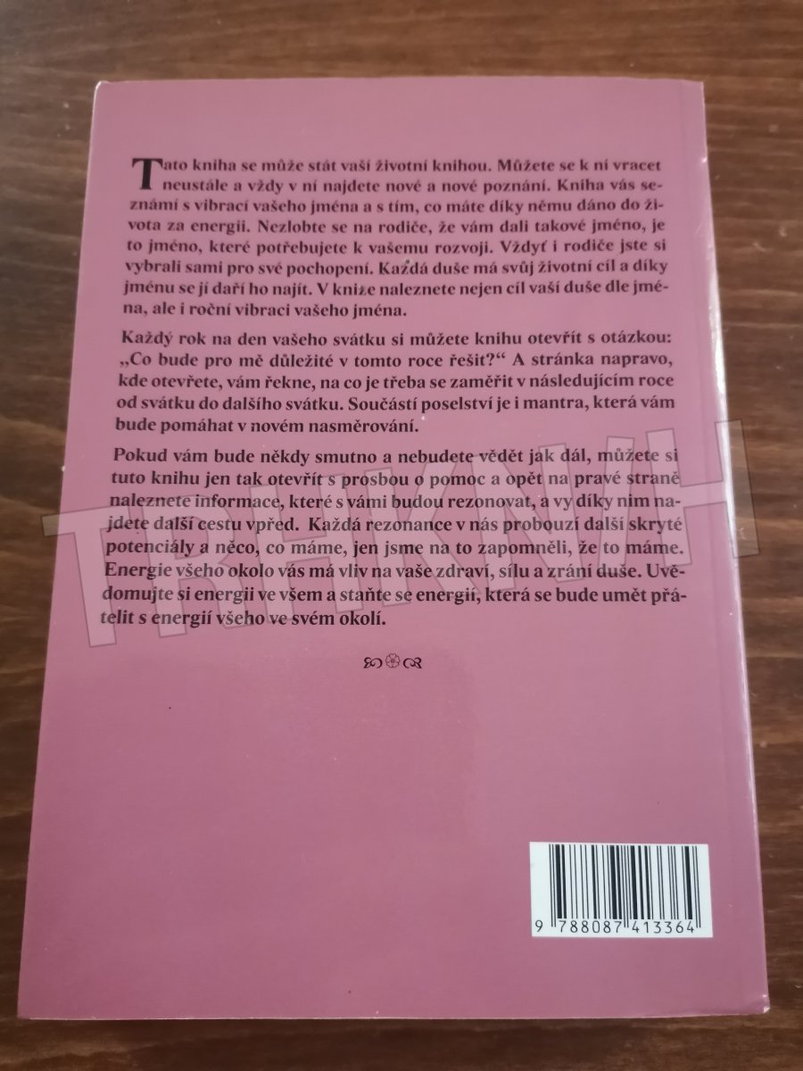 Tato kniha se může stát vaší životní knihou. Můžete se k ní vracet neustále a vždy v ní najdete nové a nové poznání. Obsahuje poselství na česká, slovenská a zahraniční jména. Už, když se narodíme, jsme součástí všeho a vše je v nás. Máme mnoho možností pro svůj život, jak ho naplnit. Energie je ve všem i v nás, vše je součástí velkého plánu Vesmíru plného různých energetických pásem. Tak, jak sílíte, tak jsou vám z Vesmíru dodávána jednotlivá pásma energií a vy se díky nim cítíte silnější a samostatnější. I vy jako duše jste si vybrali rodiče, které si přitáhla vaše energie. Vaše energie se potřebuje učit prostřednictvím energie vašich rodičů. Máte něco společného, čeho se chcete vzájemně zbavit, něco, čeho se chcete oprostit, a to je karma. A něco, co si chcete vzájemně předat k obohacení, ale také k poučení, a to je učení. Vzájemně se učíte pochopit a porozumět otázkám života a skrze ně sílit na těle, na duchu i na mysli. Každý rok na den vašeho svátku si můžete knihu otevřít s otázkou: Co bude pro mě důležité v tomto roce řešit? A stránka napravo, kde otevřete, vám řekne, na co je třeba se zaměřit v následujícím roce od svátku do dalšího svátku. Součástí poselství je i mantra, kterou si můžete říkat 3 x za sebou denně po dobu 3 měsíců nepřetržitě a ona vám bude pomáhat v novém nasměrování.