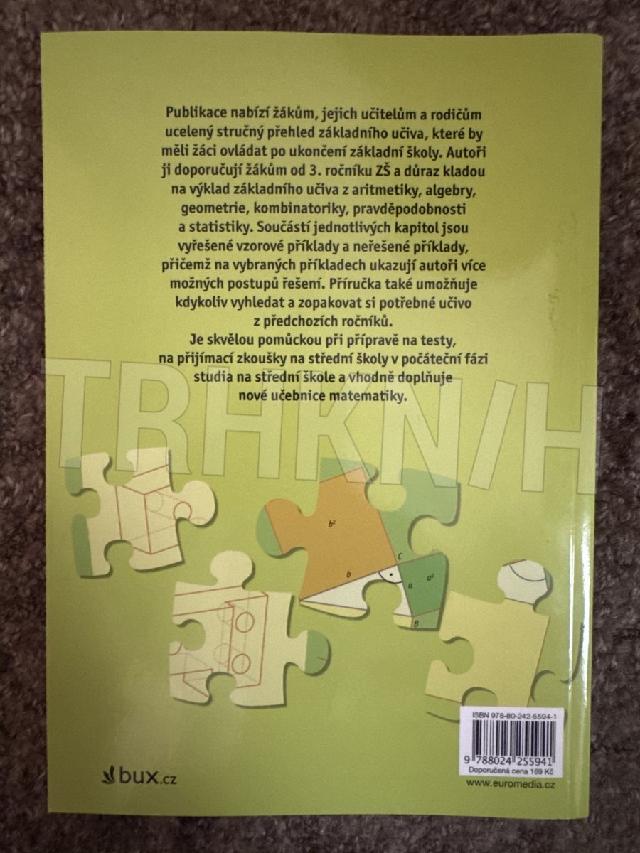 Publikace nabízí žákům, jejich učitelům a rodičům ucelený stručný přehled základního učiva matematiky, které by měli žáci ovládat po ukončení základní školy. Autoři ji doporučují žákům od 3. ročníku ZŠ a obsahuje výklad z aritmetiky, algebry, geometrie, kombinatoriky, pravděpodobnosti a statistiky. Součástí jednotlivých kapitol jsou vyřešené vzorové příklady a neřešené příklady k procvičení. Na vybraných příkladech autoři rovněž ukazují víc možných postupů. Díky přehlednému členění příručka umožňuje kdykoli snadno nalézt a zopakovat si potřebné učivo z předcházejících ročníků.Je výbornou pomůckou pro přípravu na testy, na přijímací zkoušky na střední školu a vhodně doplňuje učebnice matematiky.